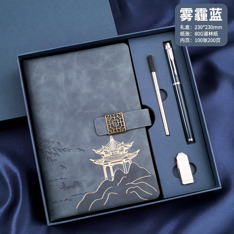 four-piece set of chinese style landscape pane buckle (haze blue notebook + same color pen + refill + u disk + gift box gift bag)