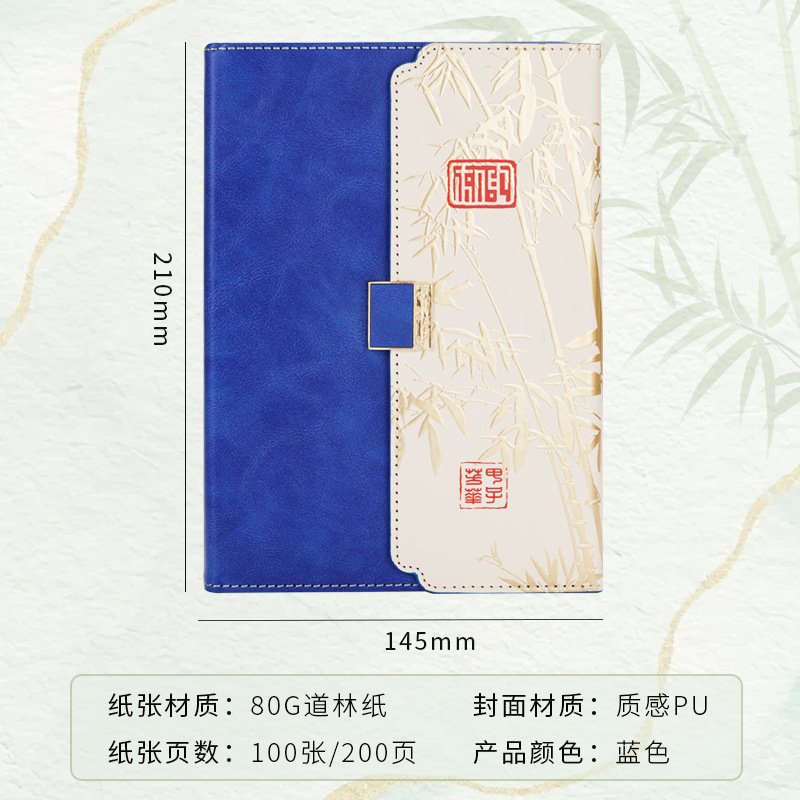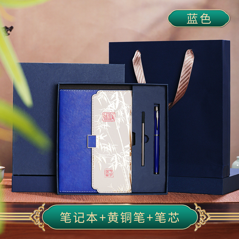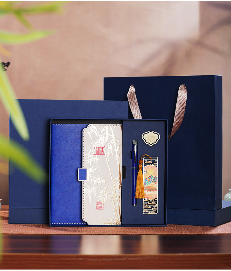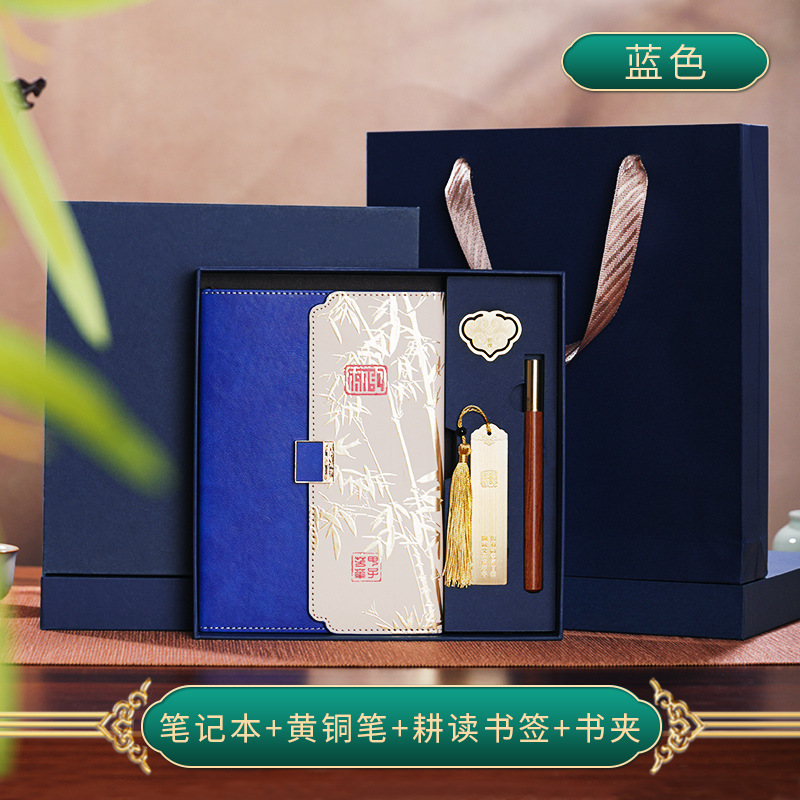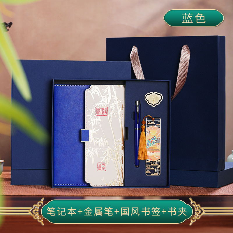 blue three folds national style four-piece set-notebook + metal pen + national style bookmark + book holder