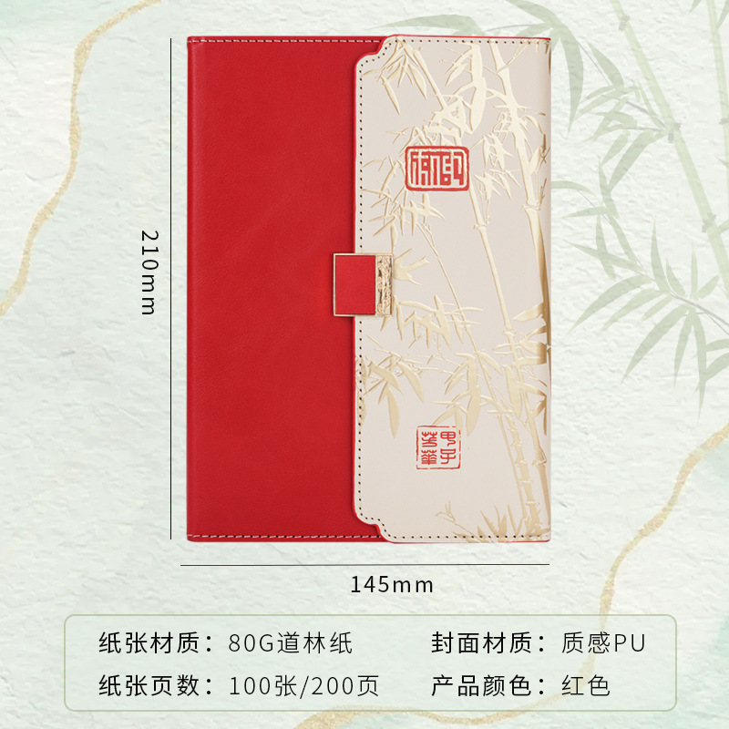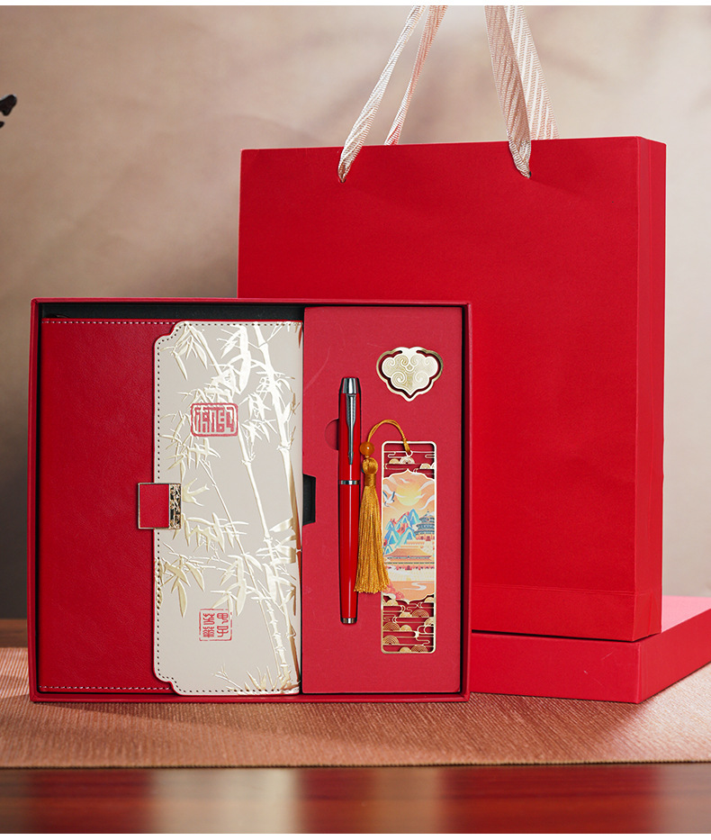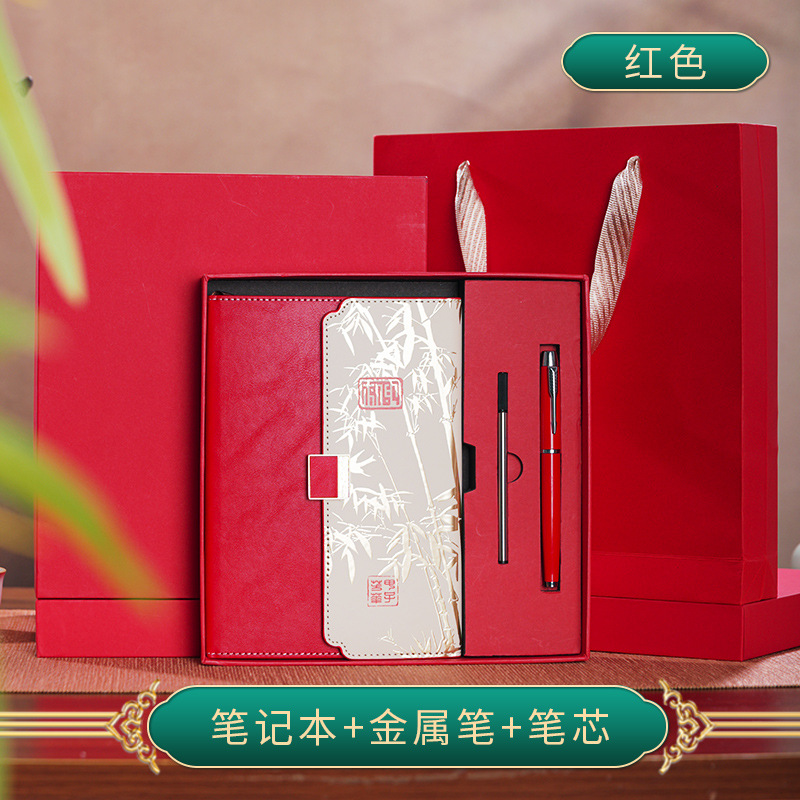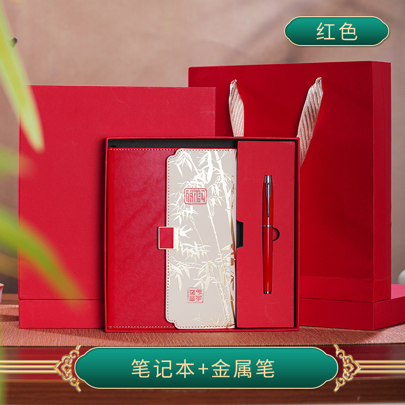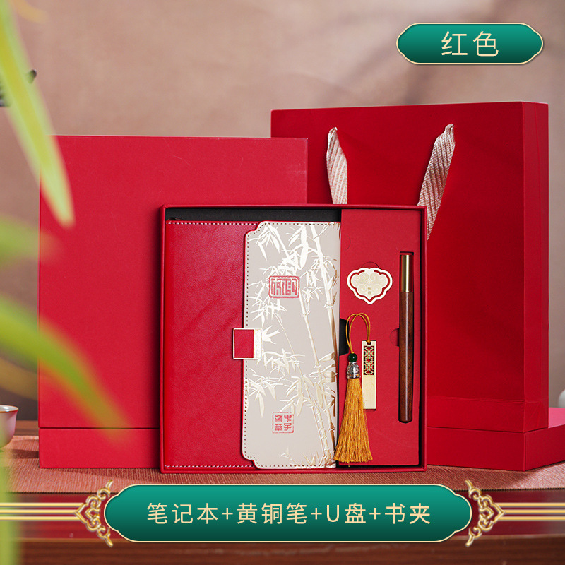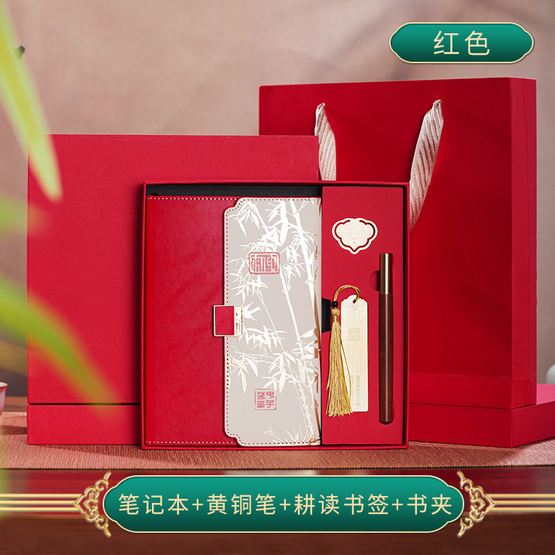 red tri-fold national style four-piece set-notebook + metal pen + national style bookmark + book holder
