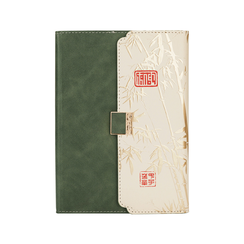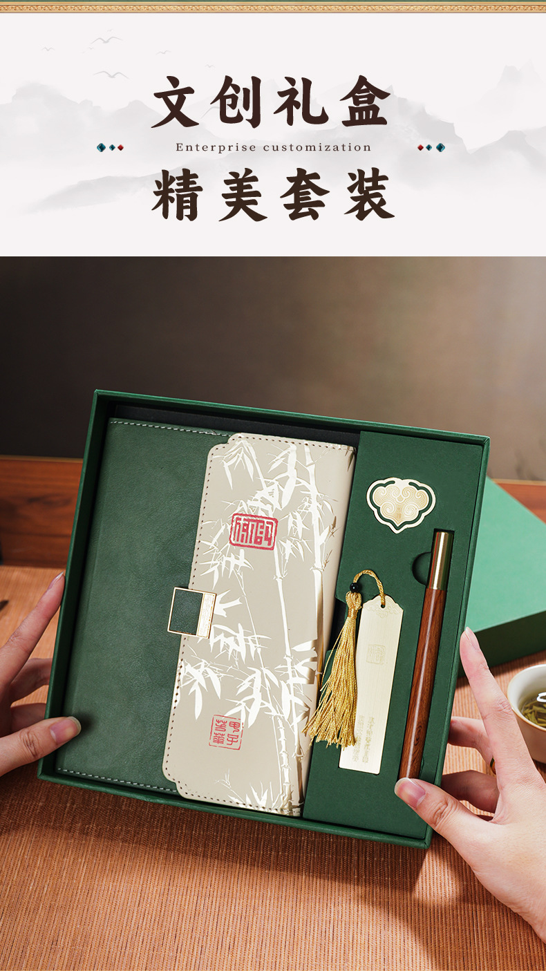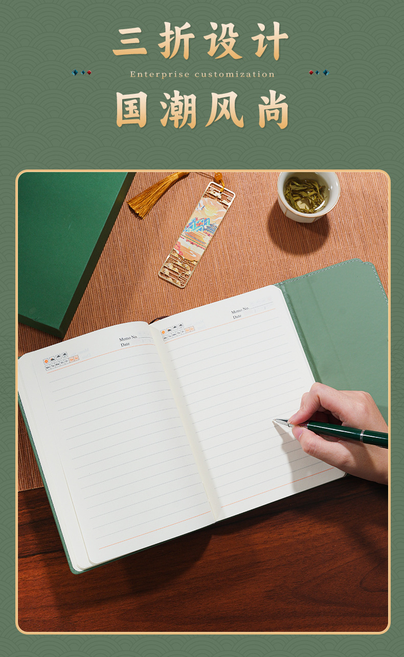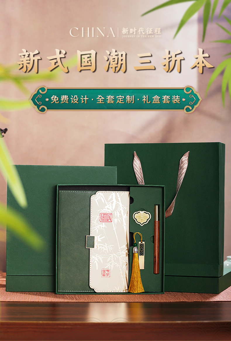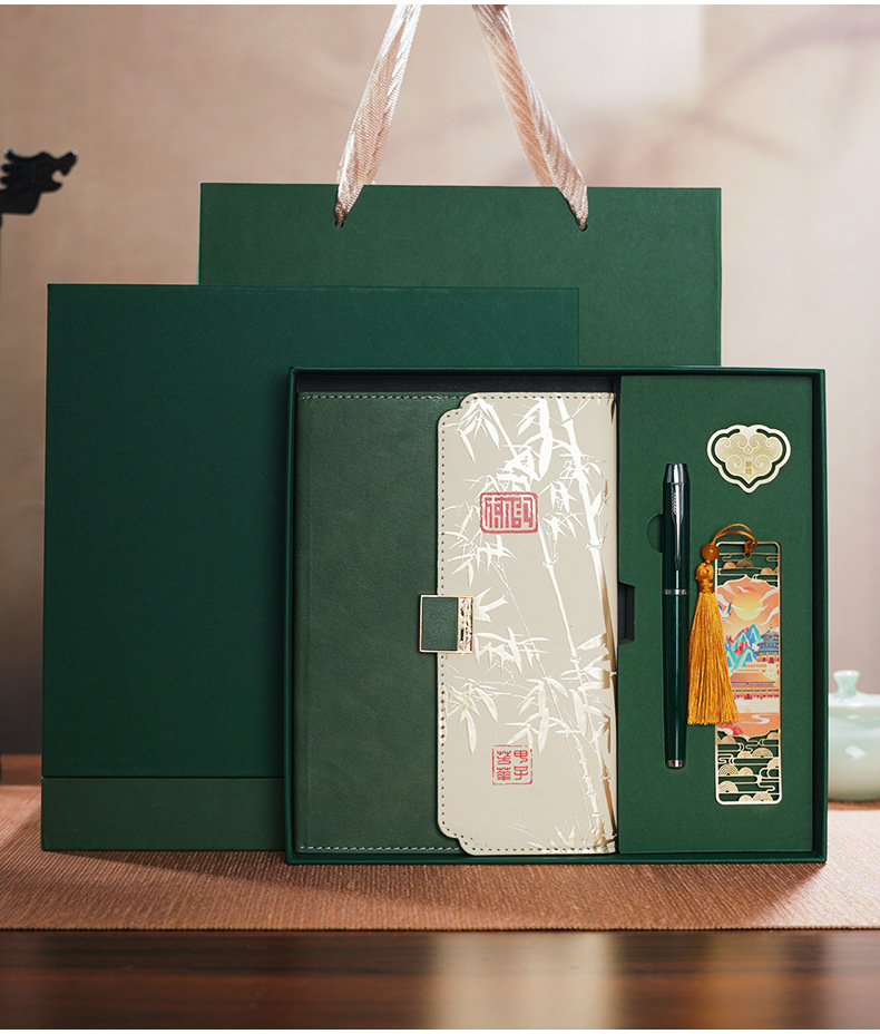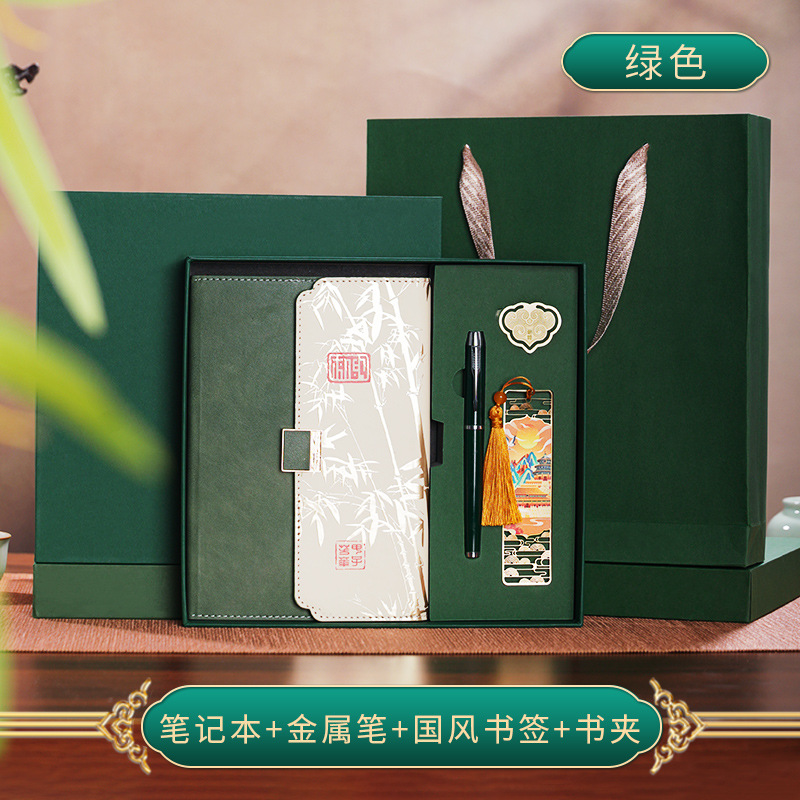green tri-fold national fashion four-piece set-notebook + metal pen + national style bookmark + book holder