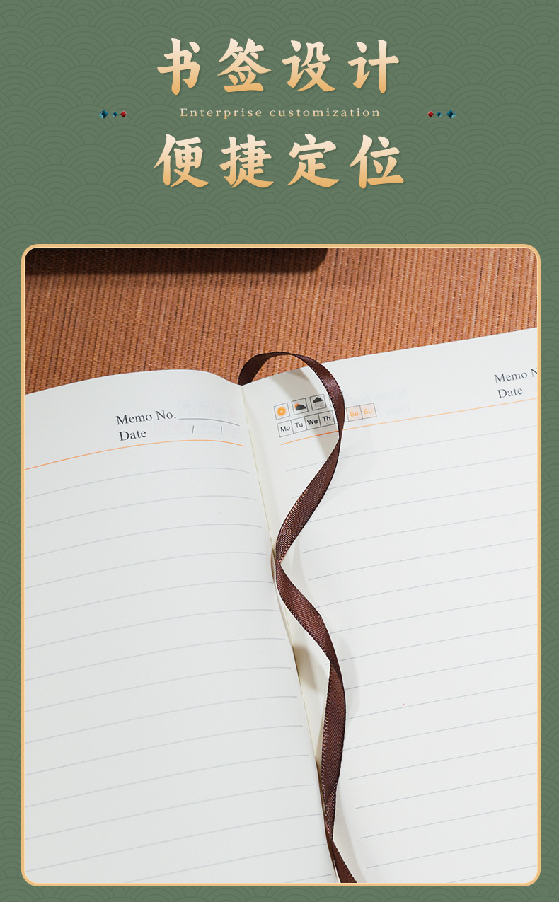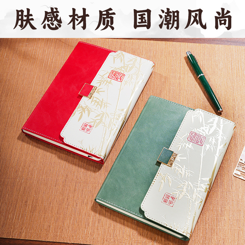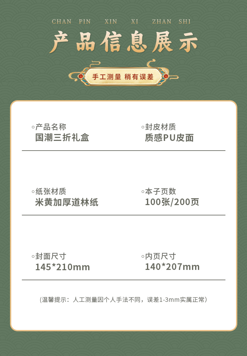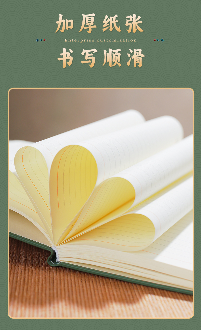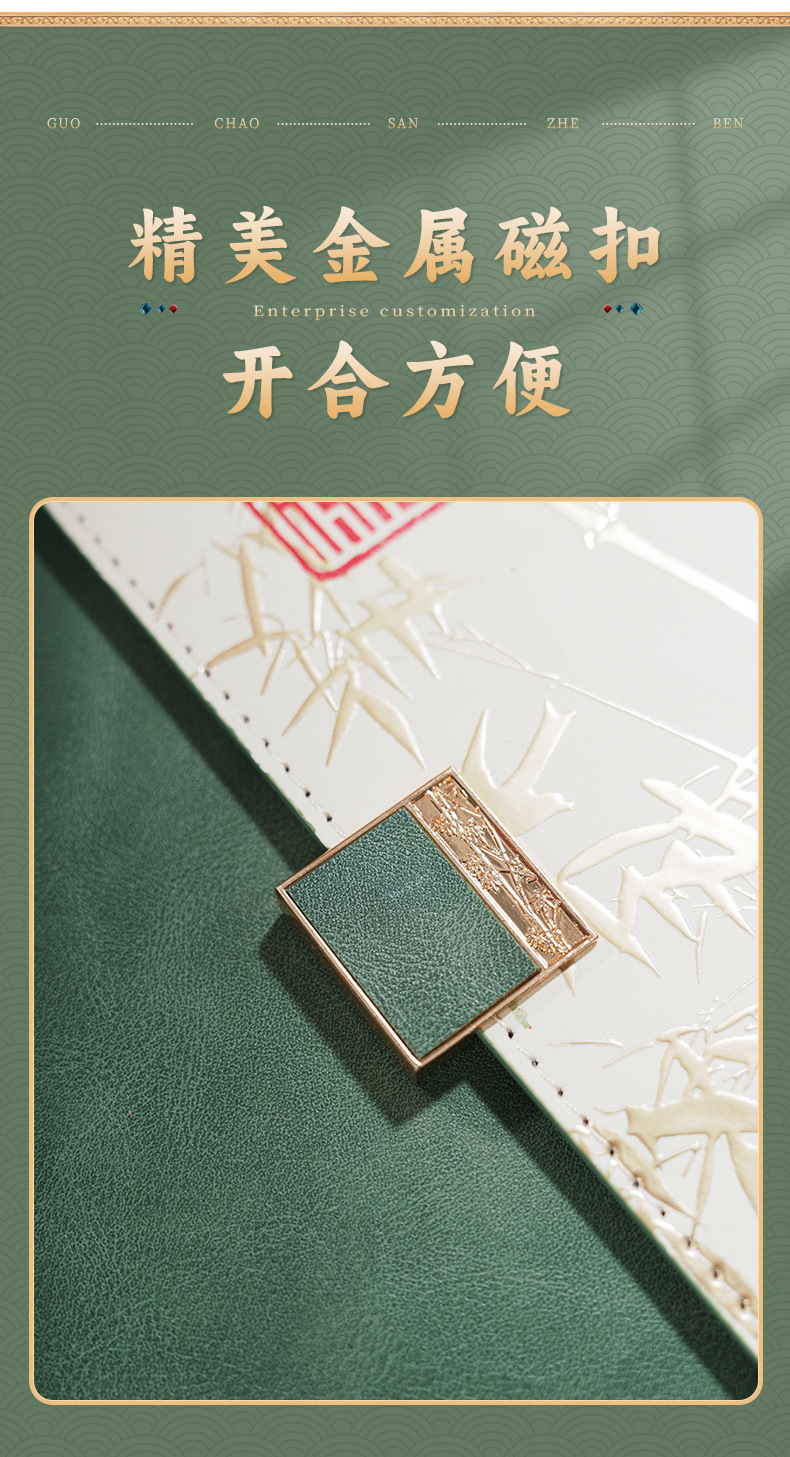 green tri-fold national fashion four-piece set-notebook + metal pen + national style bookmark + book holder