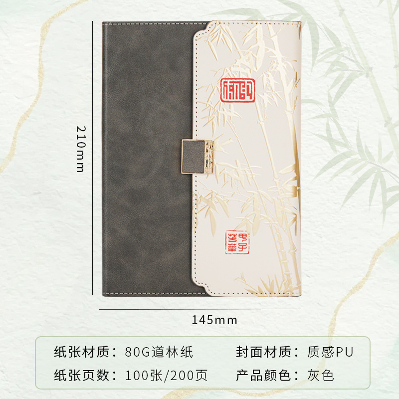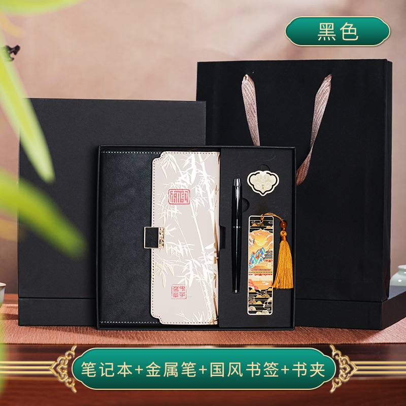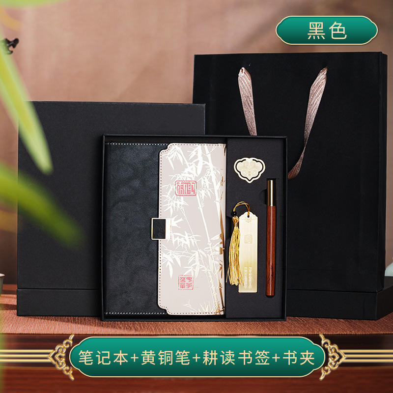 black three-fold national style four-piece set-notebook + metal pen + national style bookmark + book holder