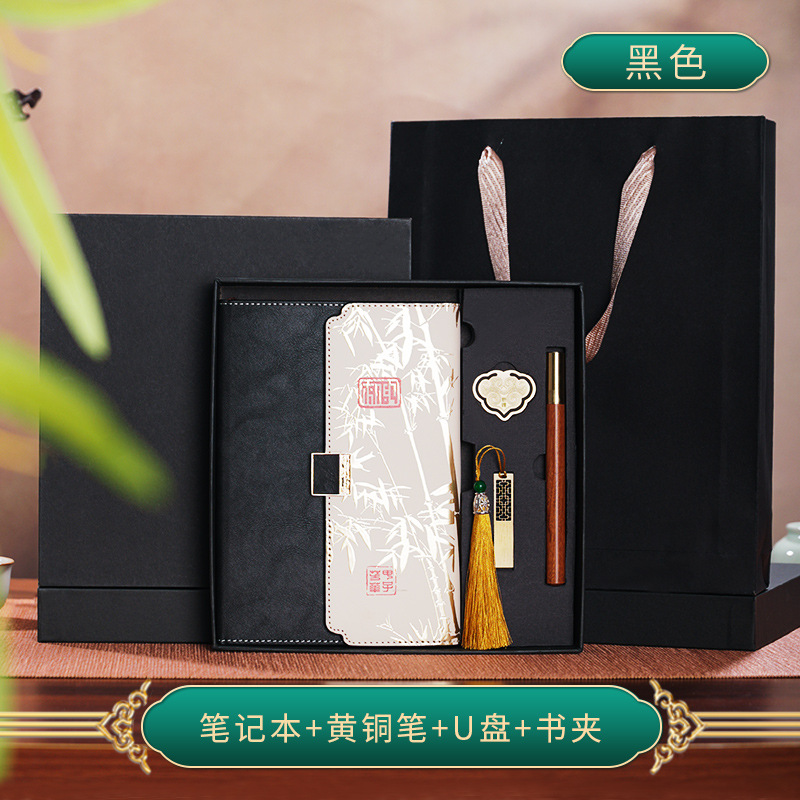 black three-fold four-piece set-notebook + brass pen + u disk + book holder