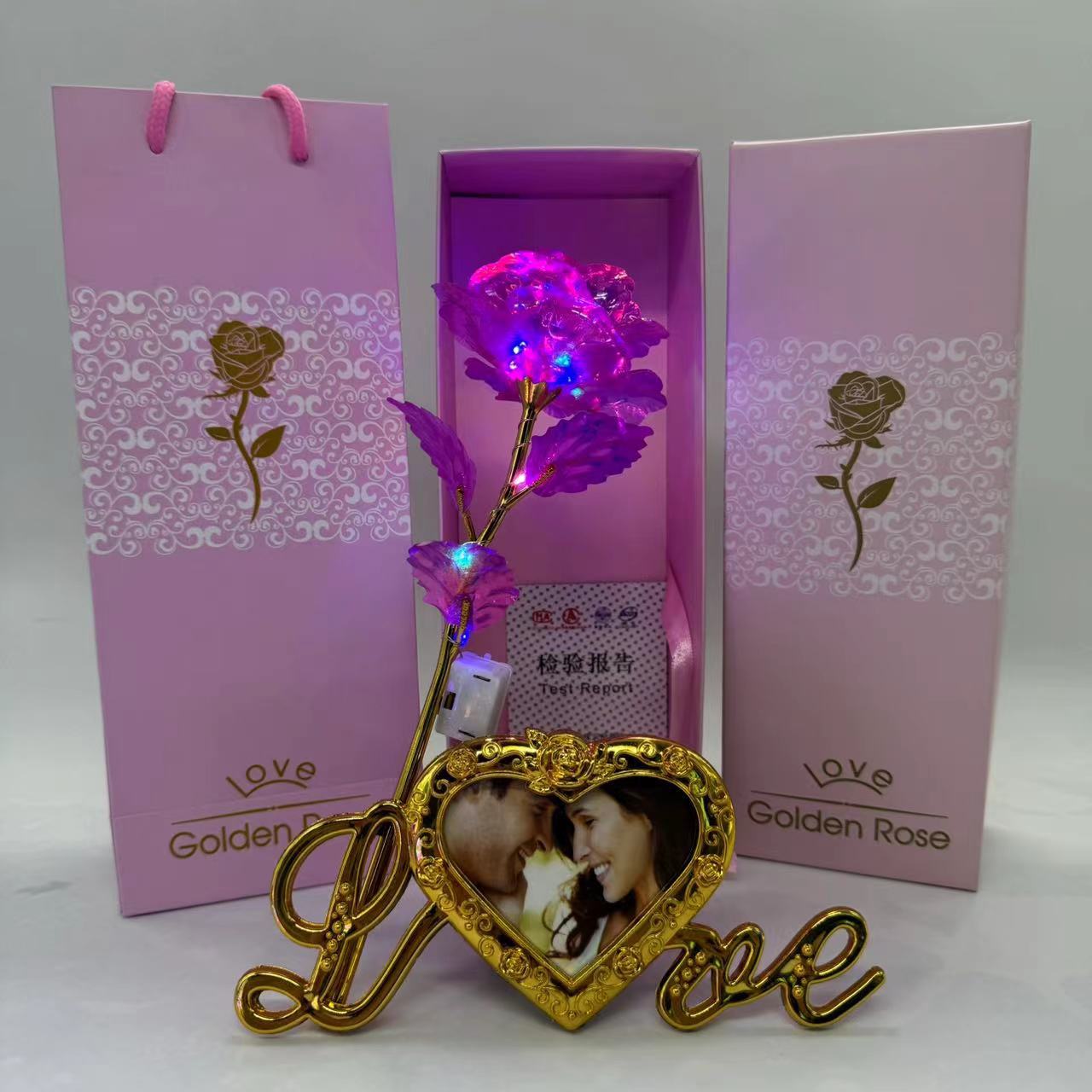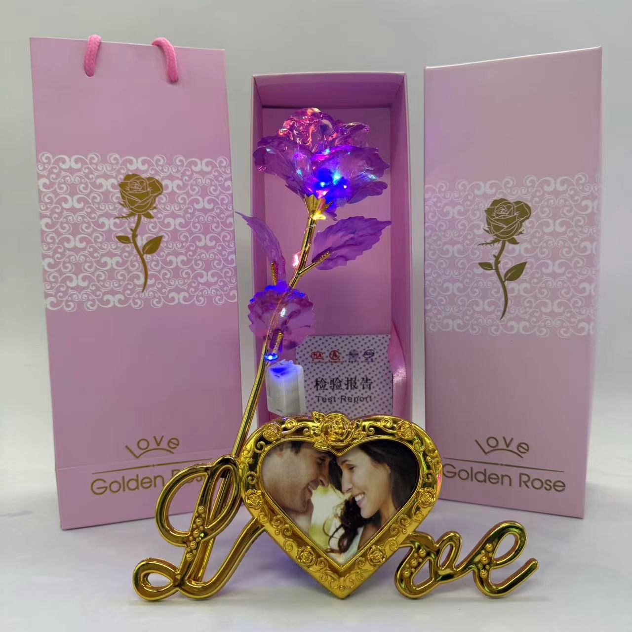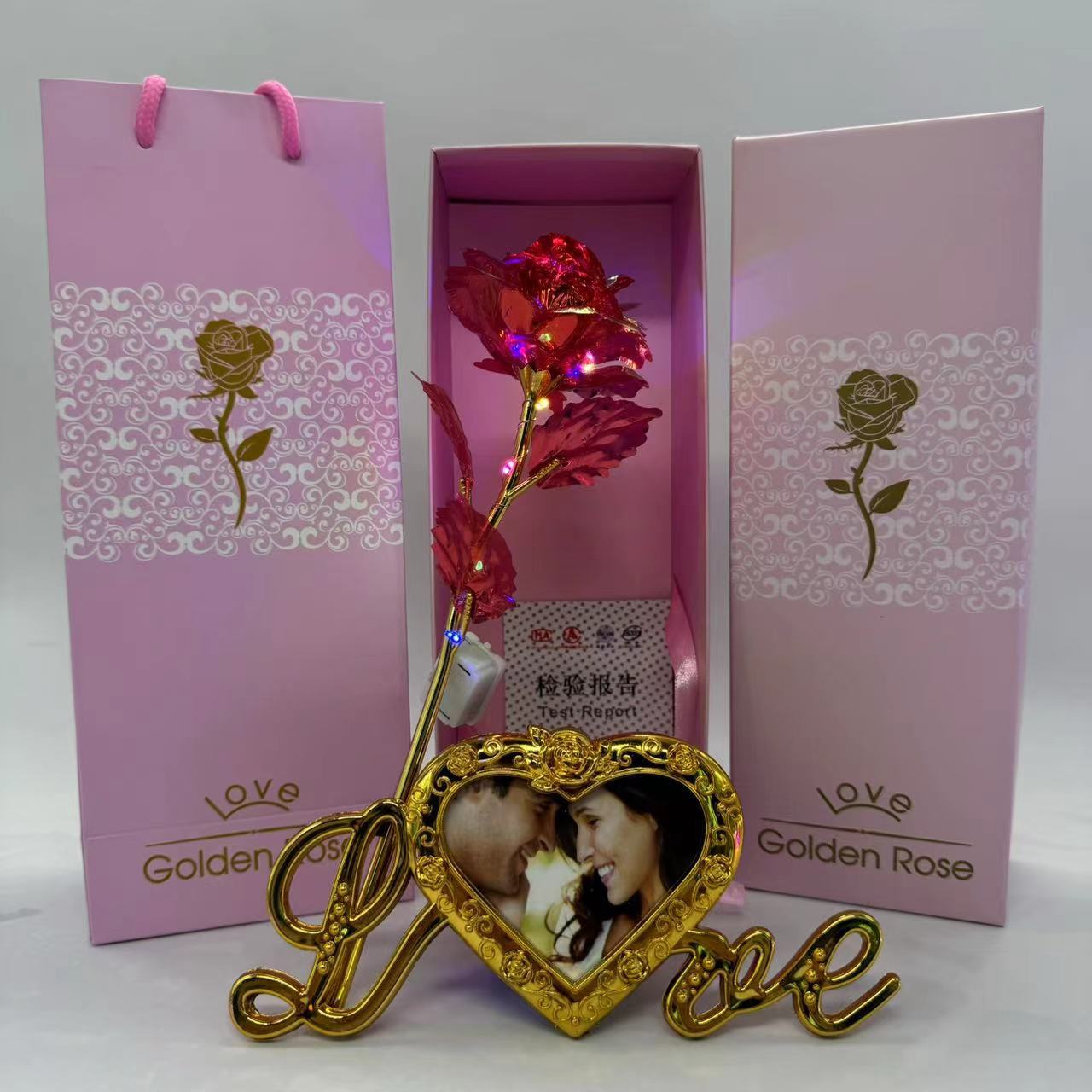 pink gift box + colorful gold flower rose red + light + photo frame base