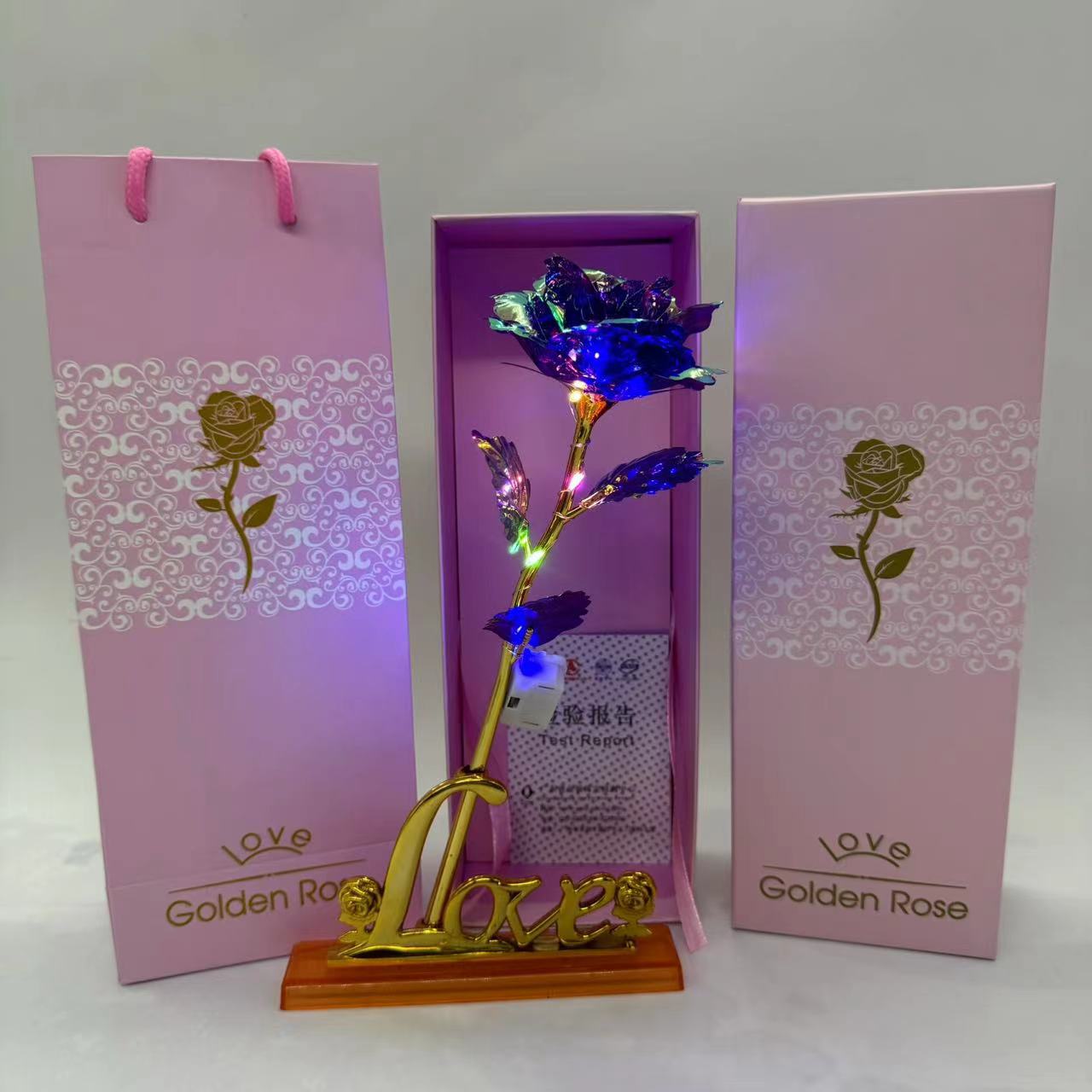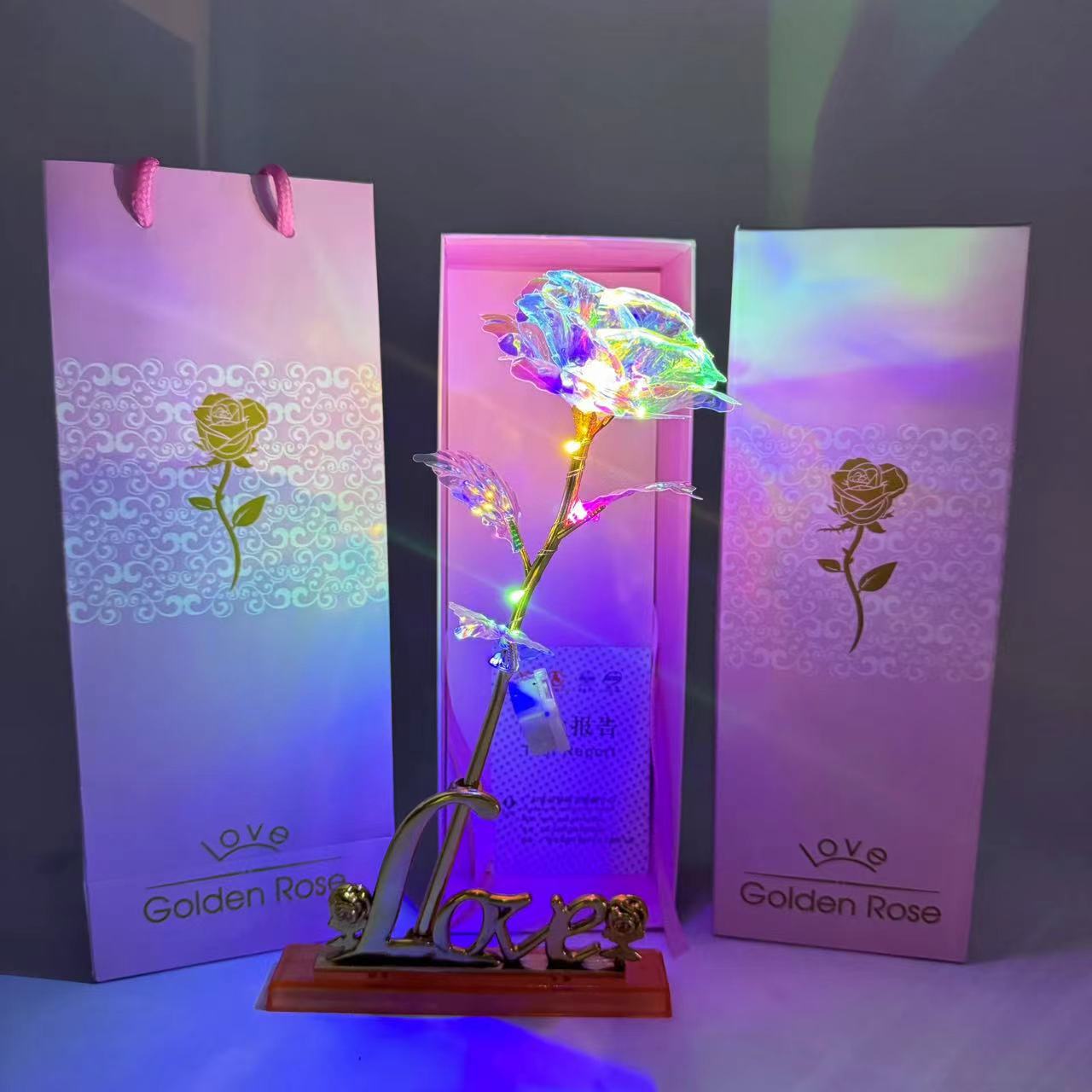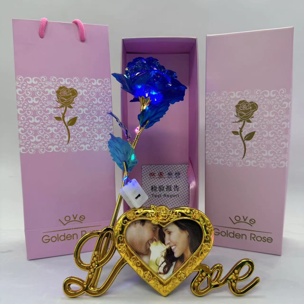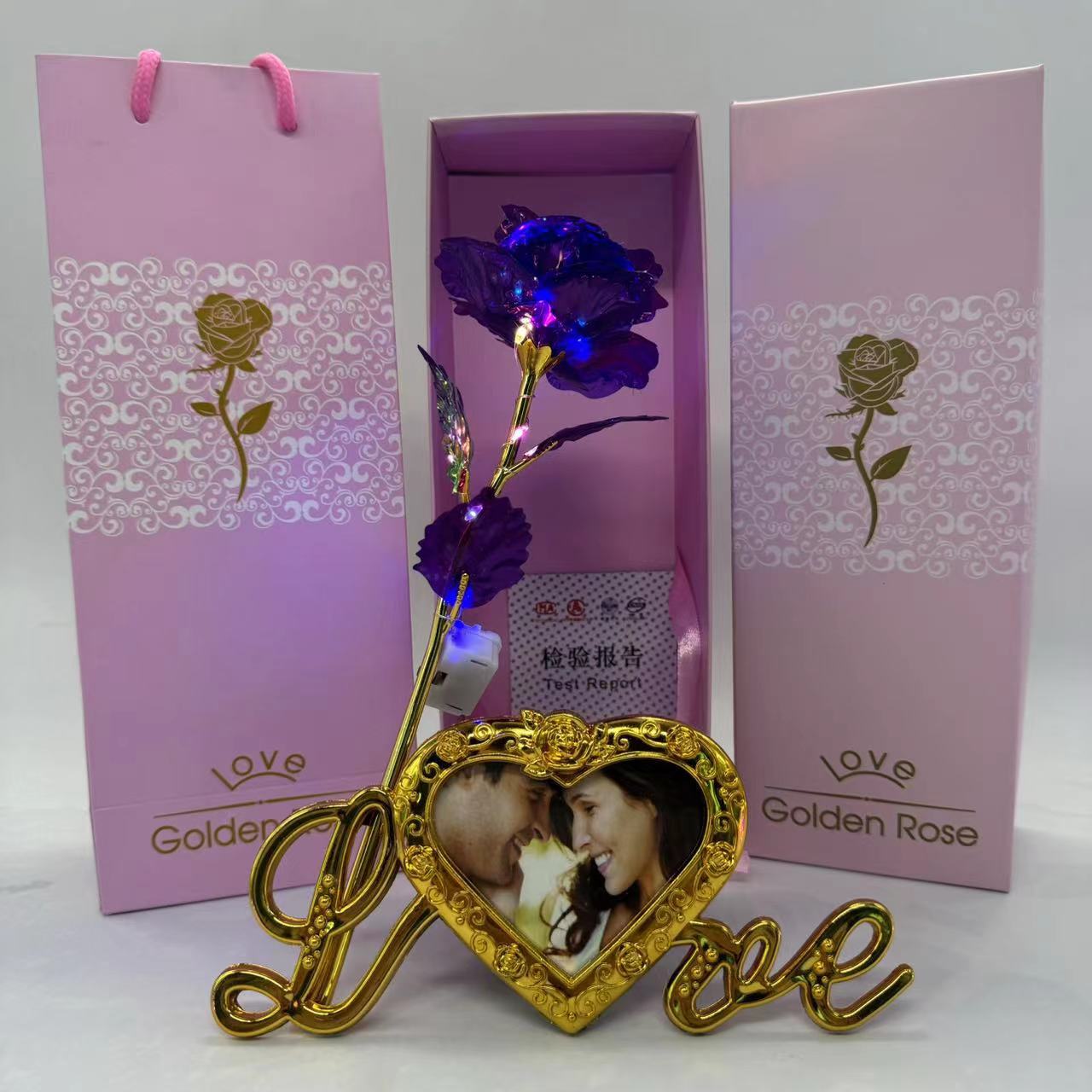 pink gift box + colorful gold flower rose red + light + photo frame base