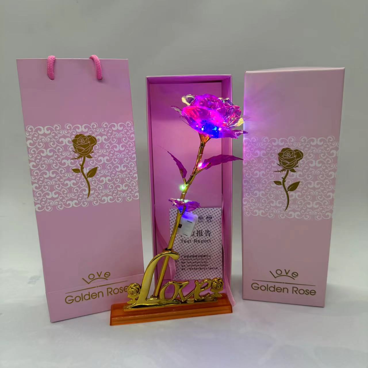 pink gift box + colorful gold flower rose red + light + lo base