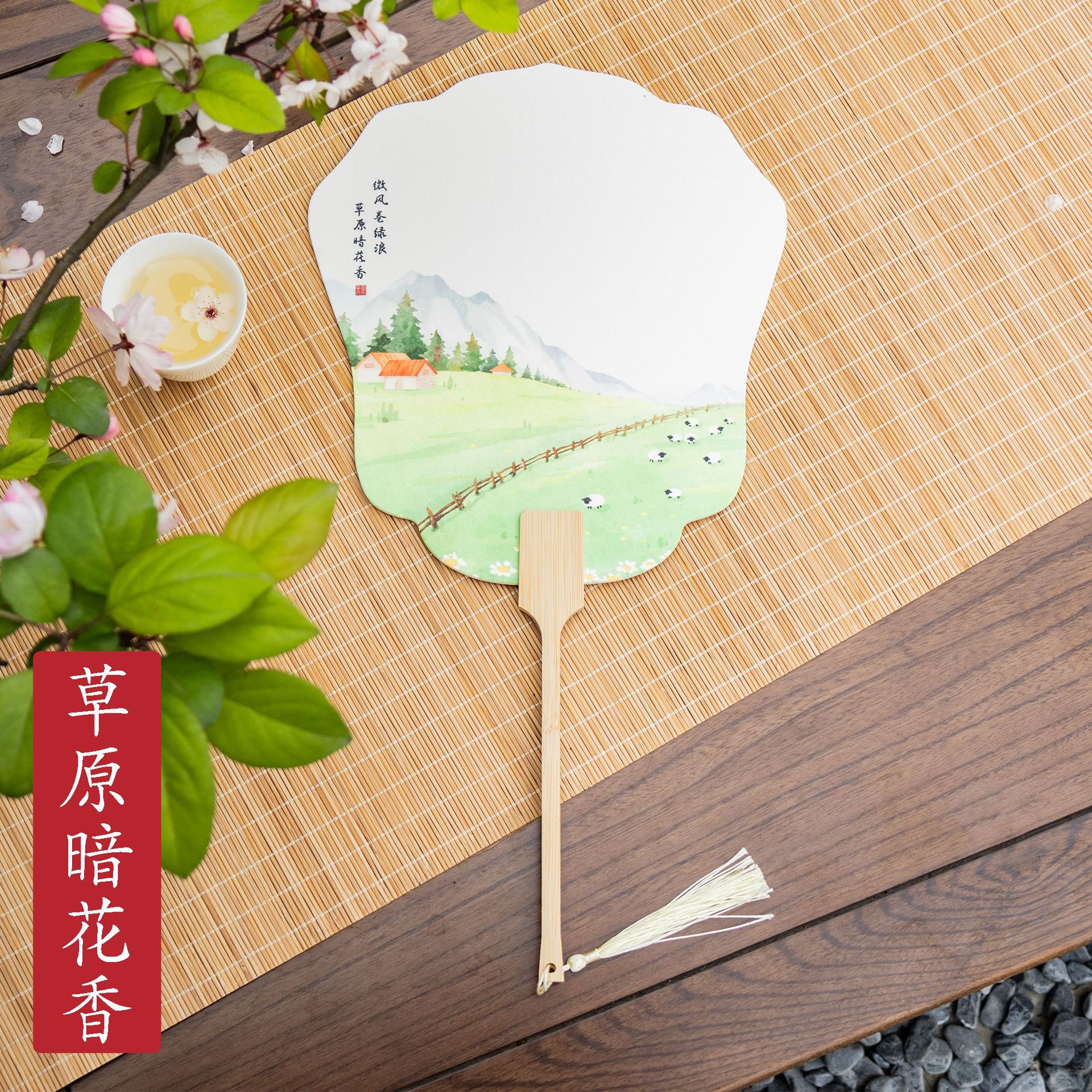 [grassland dark flower fragrance] spring landscape paint fan