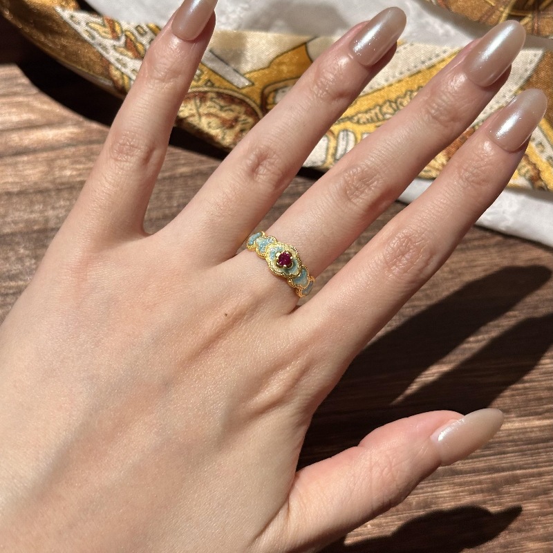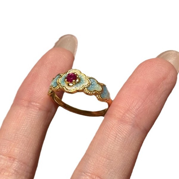 blue flower enamel drip glazed ruby ring