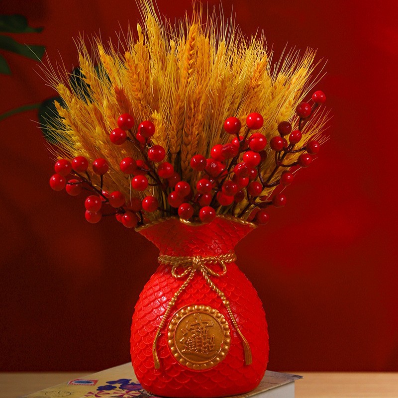 red vase + wheat + short hollyberry