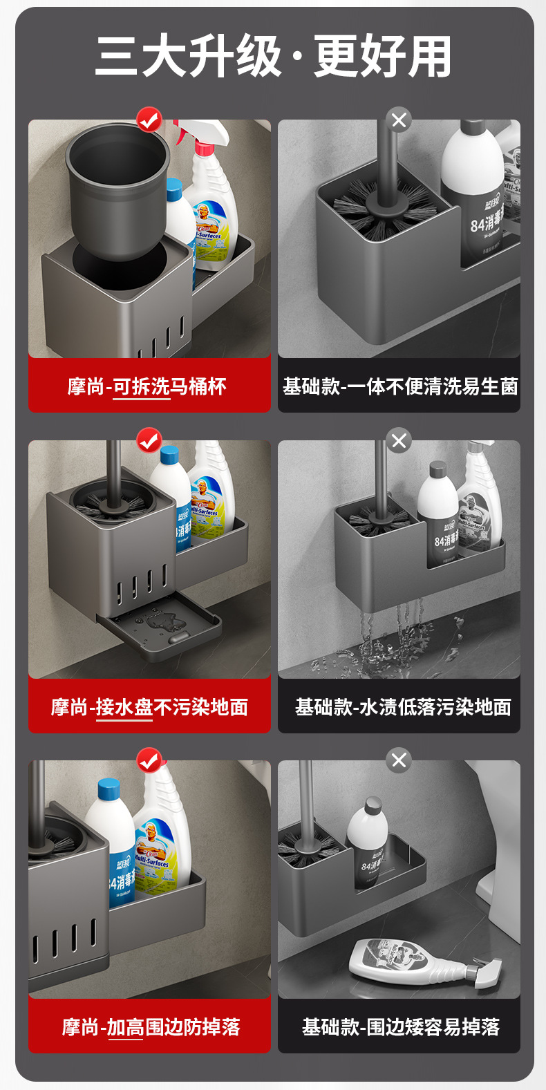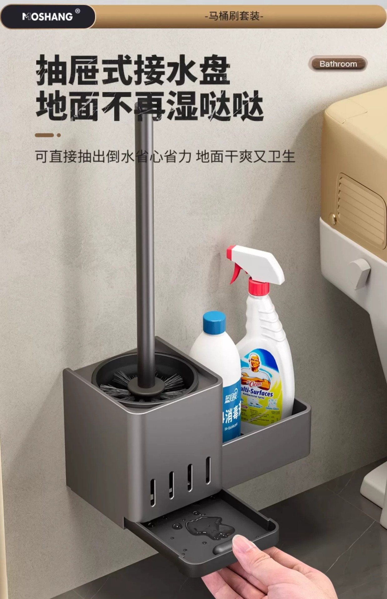 [upgrade with water collection tray & lengthened silicone handle] gun gray-toilet brush rack