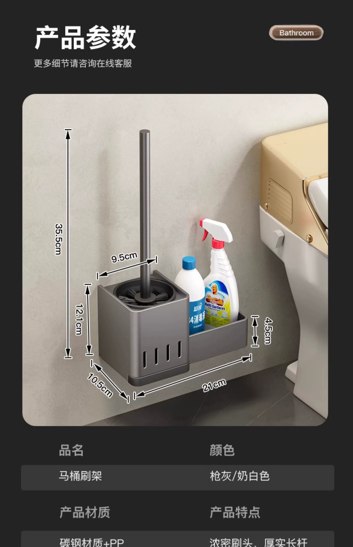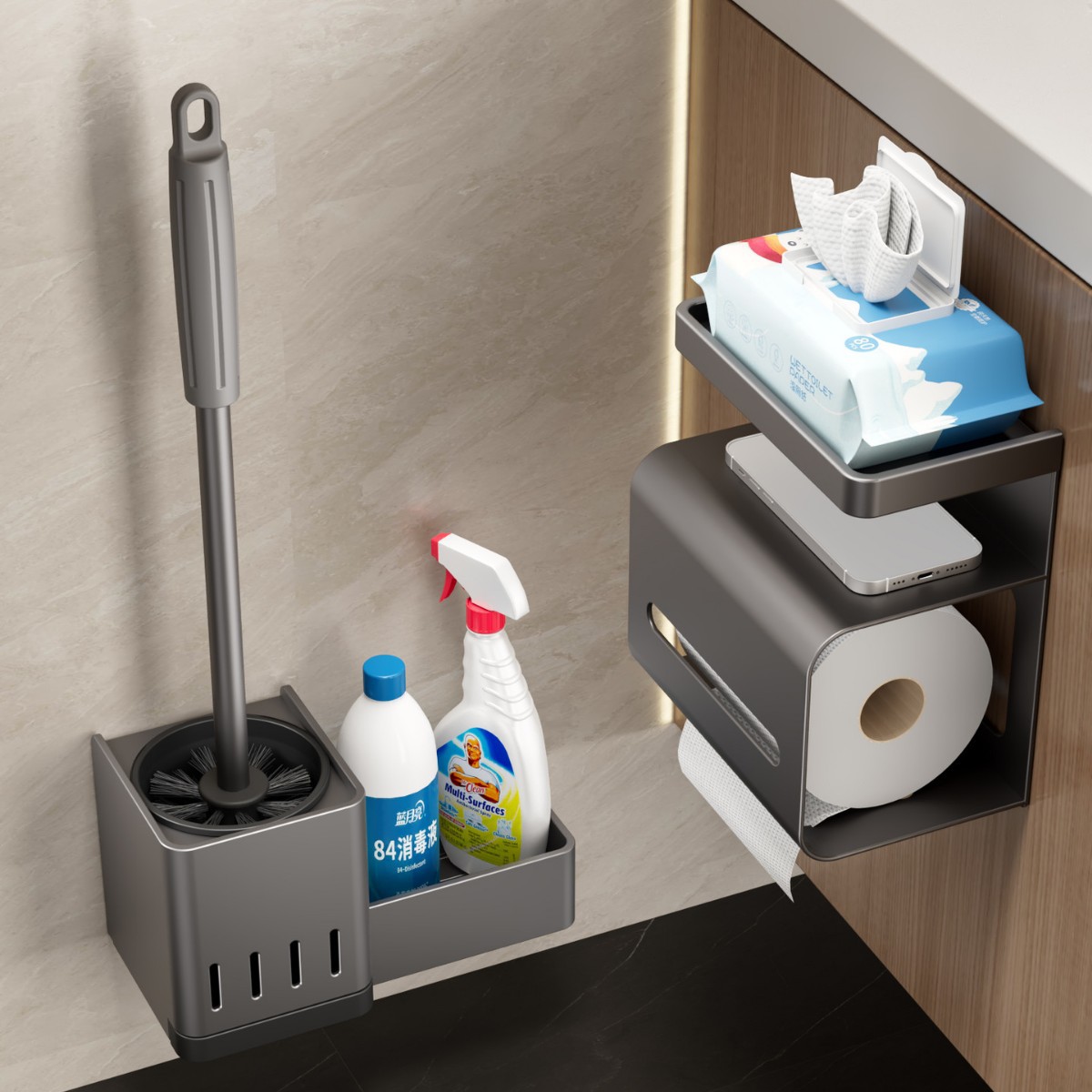 [upgraded with water collection tray] gun gray-toilet brush storage rack