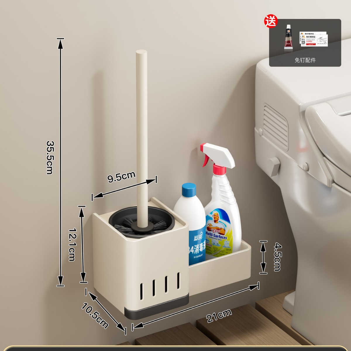 [upgraded with water collection tray] milk white-toilet brush storage rack