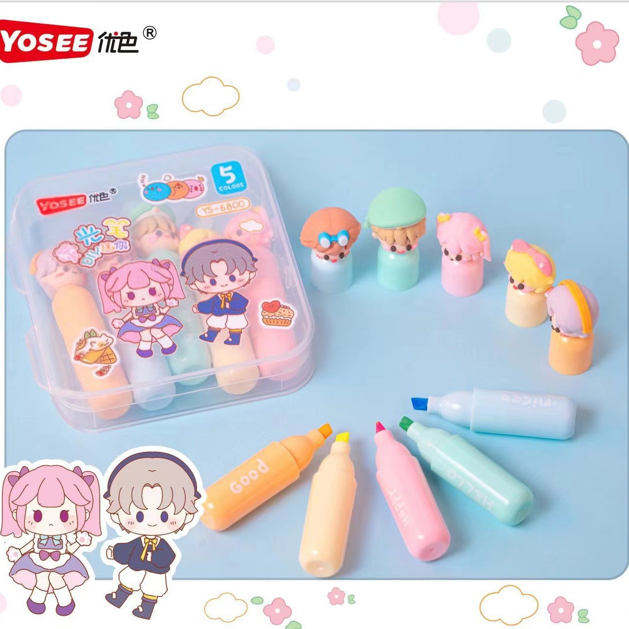 cat head + smiley face 6 colors fluorescent pen