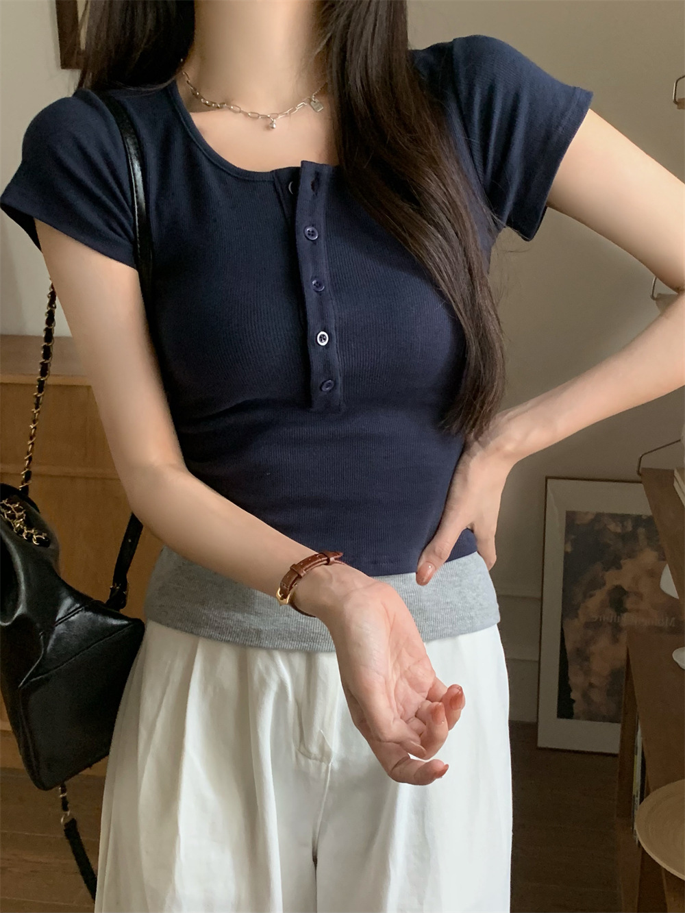 216# real shot pure cotton summer solid color waist tight slimming patchwork fake two-piece color matching button short sleeve t-shirt for women