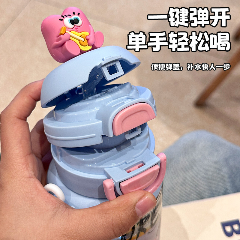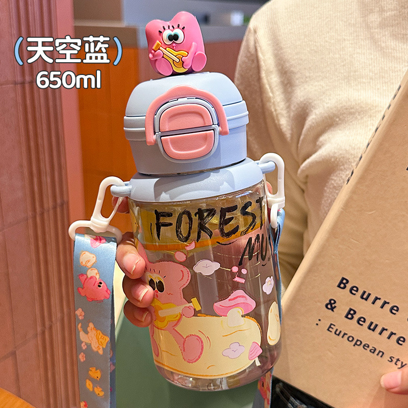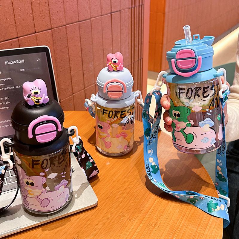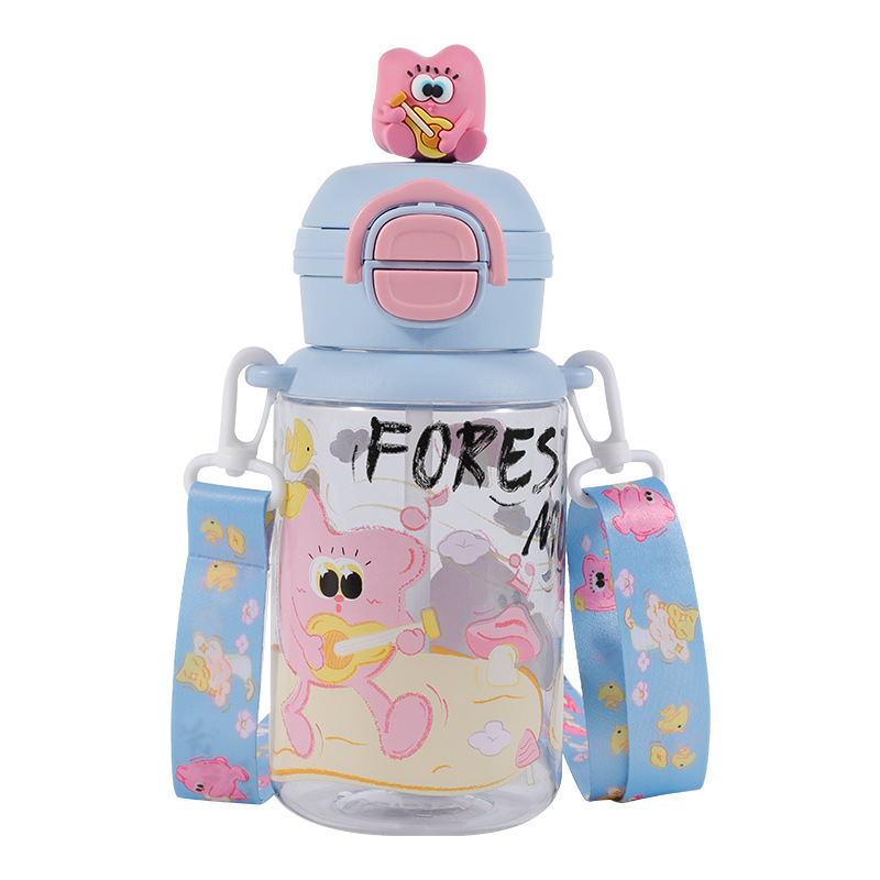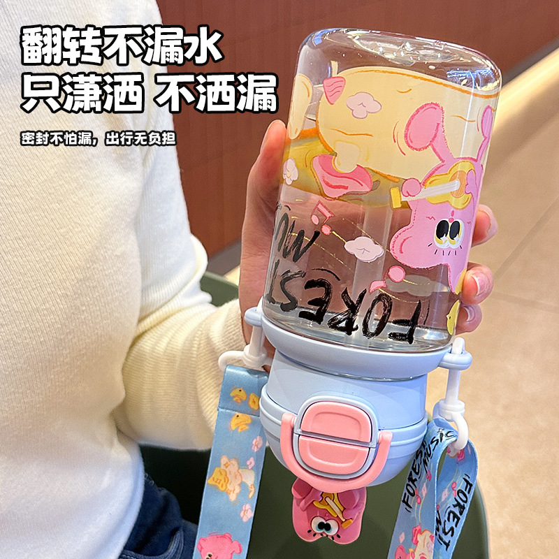 good-looking plastic cup high temperature resistant cartoon children's double drink straw cup portable lanyard strap girls kindergarten water bottle