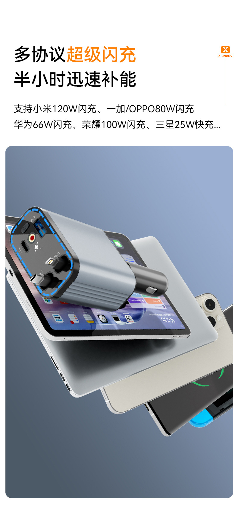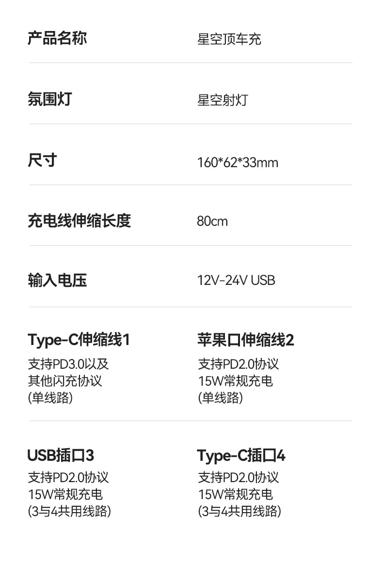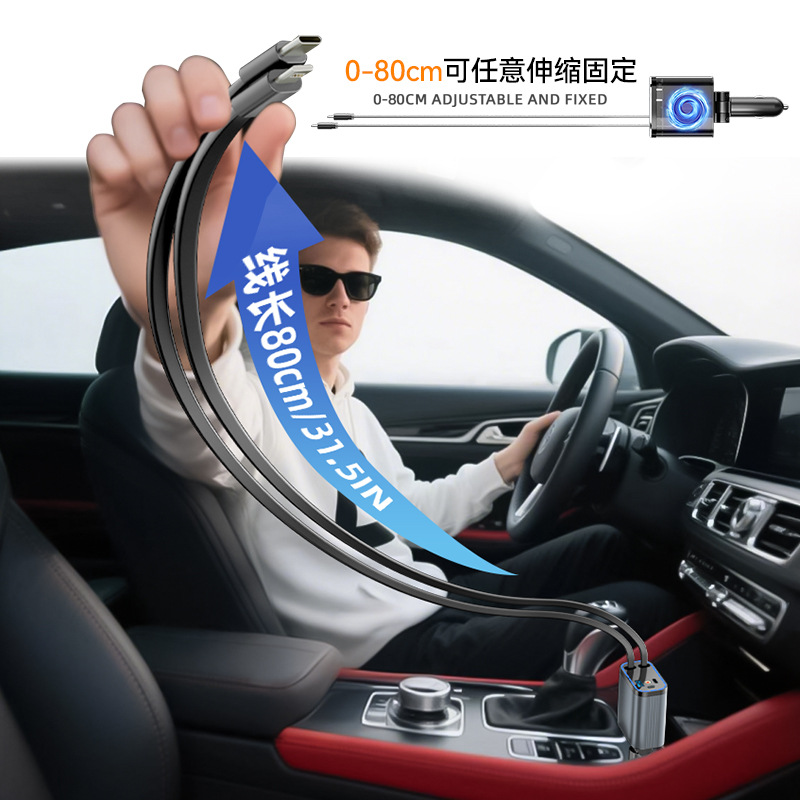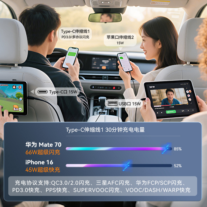 【Product Description】: The C-type retractable cable is a fast-charging cable that supports various brand fast-charging protocols (PD, QC, SCP/FCP, PPS/AFC, Supervooc), while the other ports charge at normal speeds.
