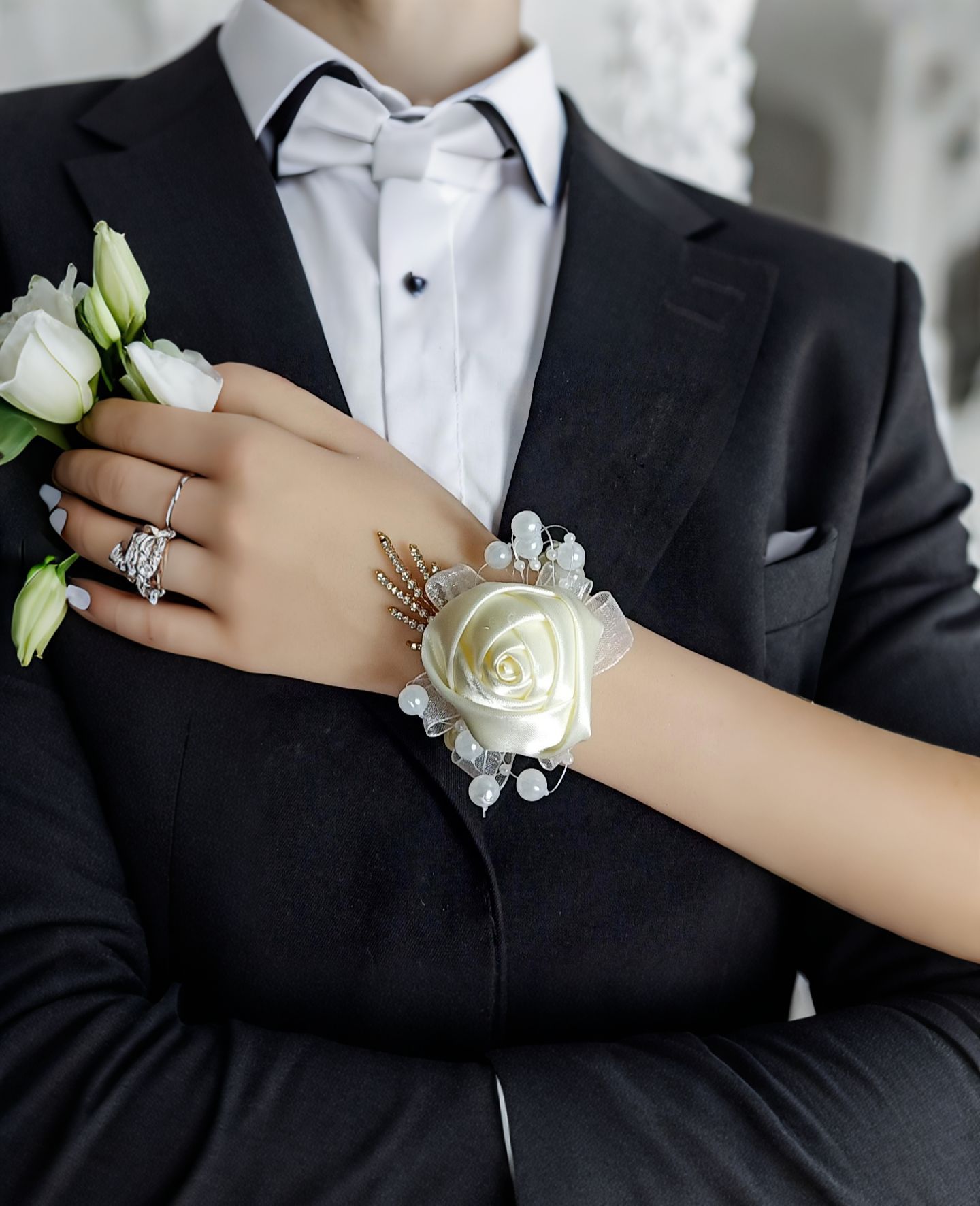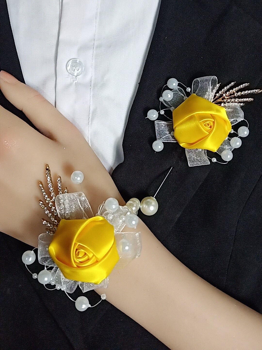beige corsage with bracelet