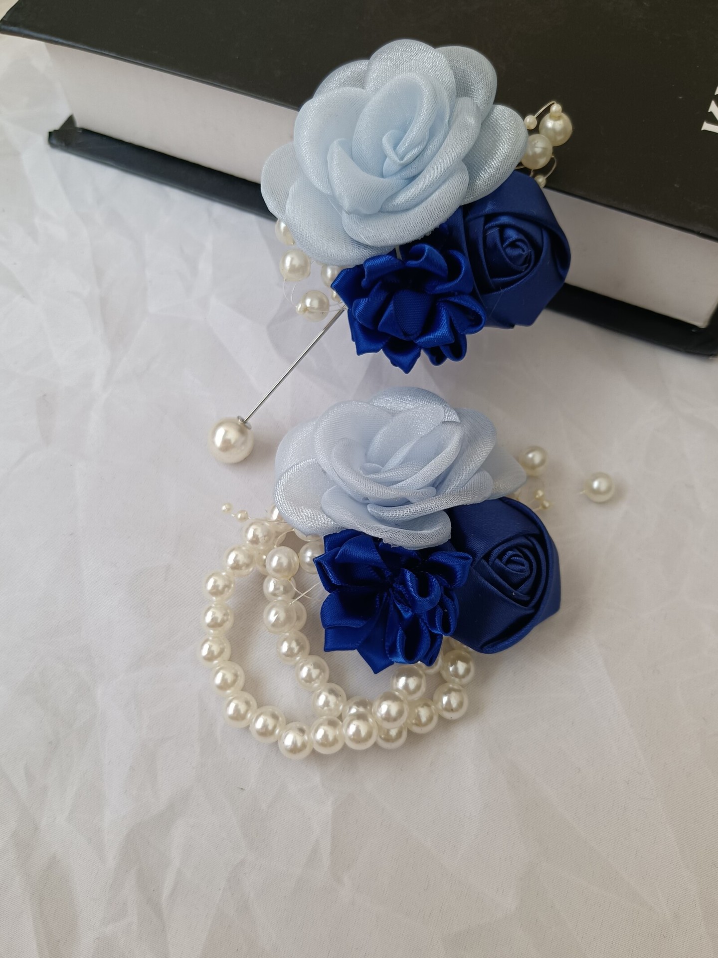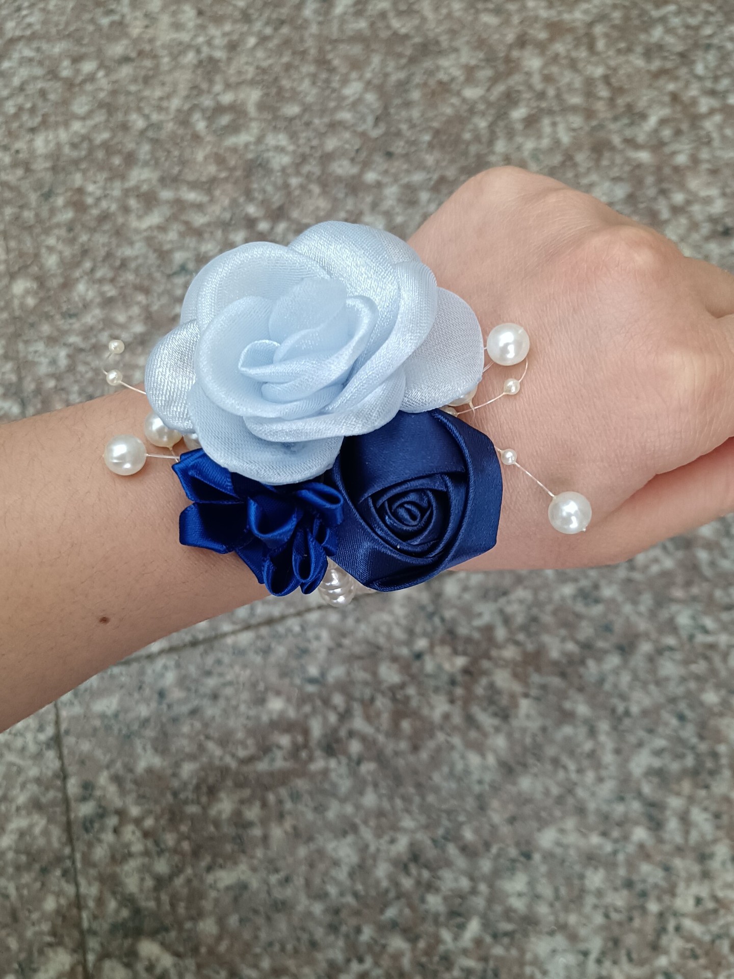 a- navy blue corsage + wrist flower