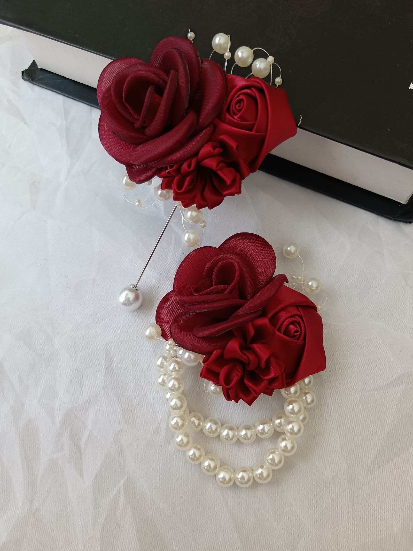 a- burgundy corsage + wrist flower