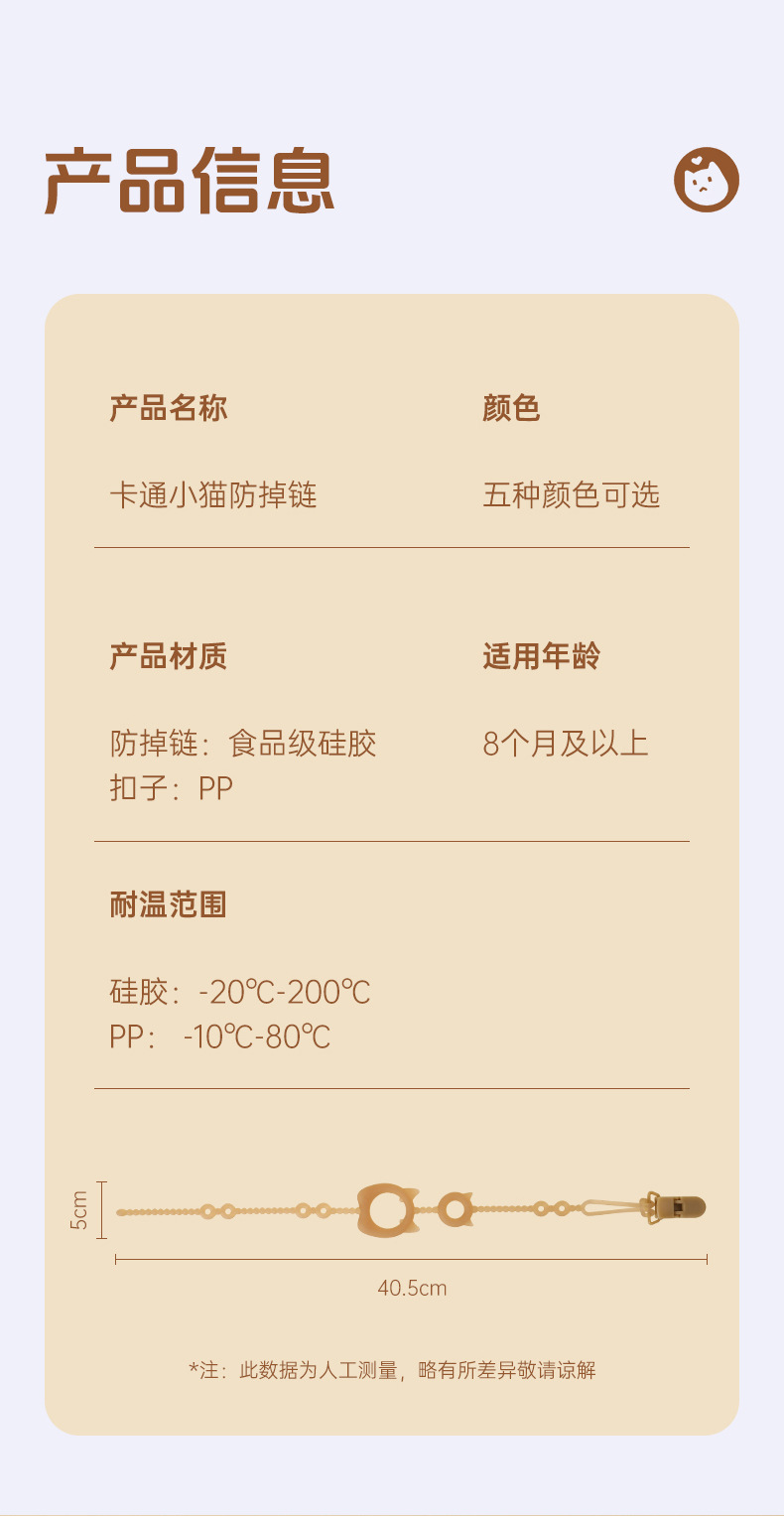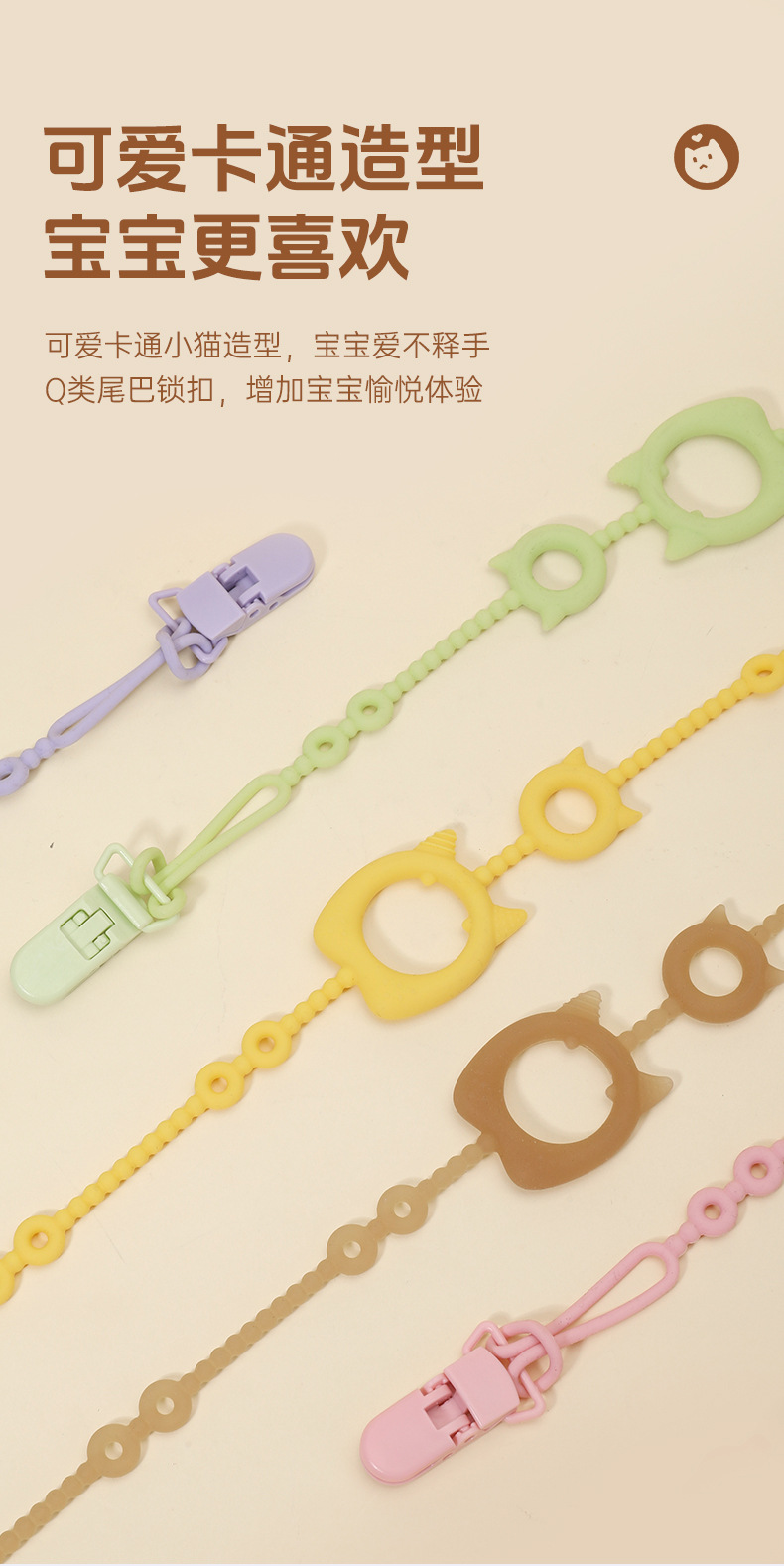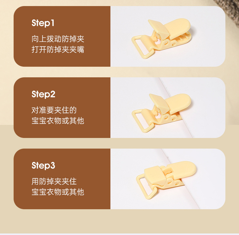 1. Clamp the pacifier chain to the corner of the baby's clothing to prevent the pacifier from falling to the ground and getting dirty.