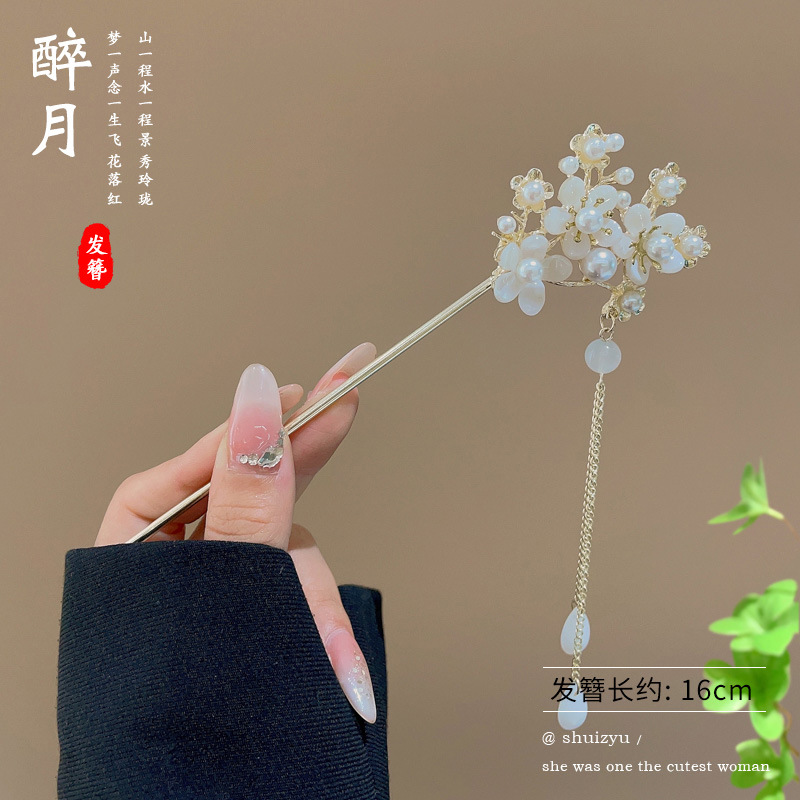 21# plum blossom light blue single pearl flower tassel hairpin (bag