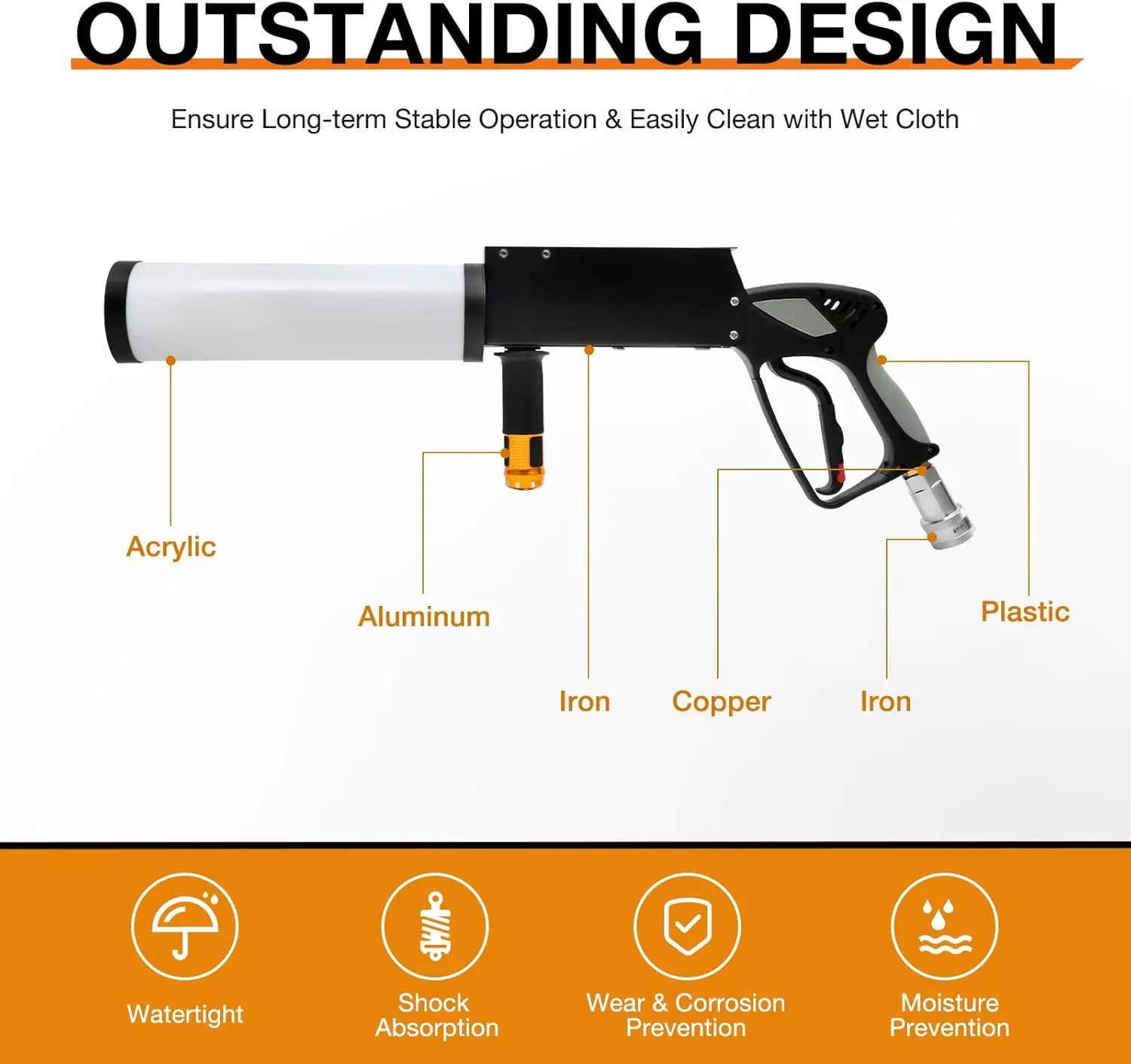 * 【Mini CO2 Handheld Blaster】The transmitting distance is ≤ 10 meters (32.8 feet); Battery: 8 AA batteries (battery life is about 8 hours); LED color: red, green, blue (automatic color change); Fuel: carbon dioxide gas; Gas pipe: 3 meters (10 feet). * 【High Efficiency】Cannon machine has a battery life of about 8 hours, and the output distance of the product is about 32.8 feet,which can meet all your needs for stage effects. * 【Flexible and Convenient】This CO2 fog machine is battery powered (battery not included) and has a 10ft air hose for more flexibility on stage. * 【Simple and Safe】The operation of this product is very simple. Each C02 fog machine needs one CO2 tank. After connecting the CO2 fog machine and the CO2 tank, you just need to hold the handle and press the start button, and the CO2 fog machine will emit a large column of white air. Immediately open the stage of the feast. The wonderful stage feast now begins. The gas emitted is carbon dioxide, an environmentally safe gas. * 【Amazing Stage Effect】This carbon dioxide fog machine has a color-changing tube that automatically changes color from red,green to blue while emitting a large amount of carbon dioxide gas. With this cool canon fog machine, any stage is no longerboring, but full of atmosphere.