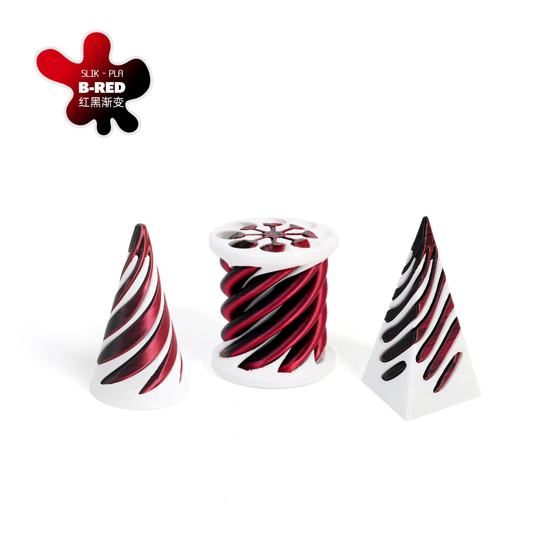 [cone + cylinder + pyramid] spinning music-laser red black-white