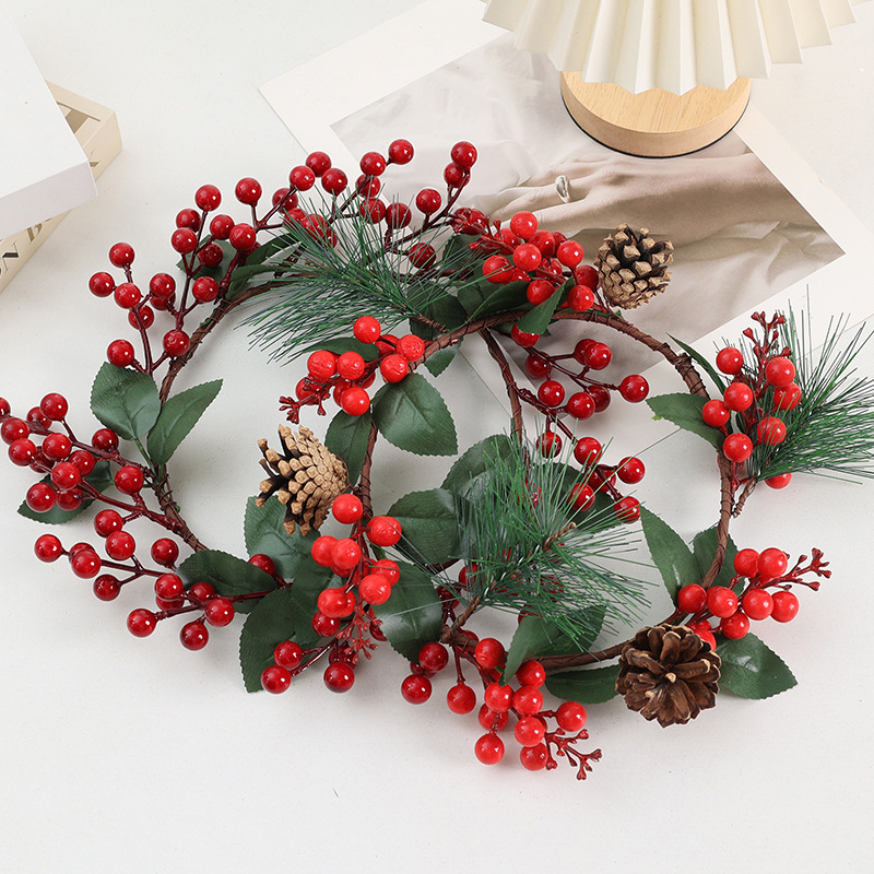 Specification: Pinecone and Red Berry Wreath: Foam Wreath Diameter 17.5cm, widest point 30cm, with 3 pine cones and 3 pine needles. 6 red berry branches, each branch with 12 small red berries. Weight: 74g