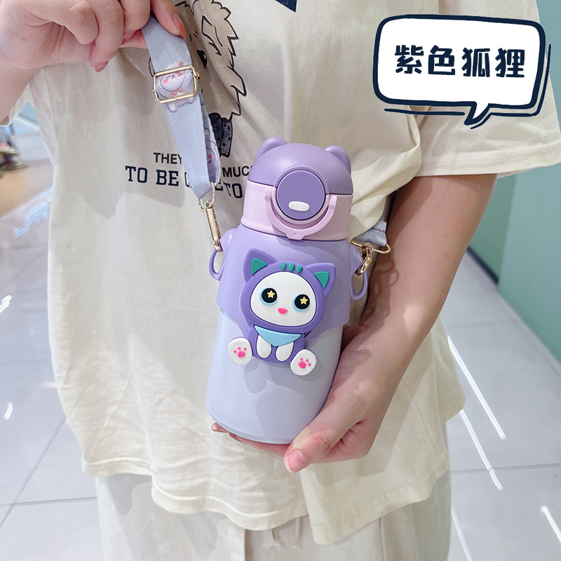 cartoon 316 stainless steel thermos cup children's straw cup men and women student portable crossbody big belly cup gift cup