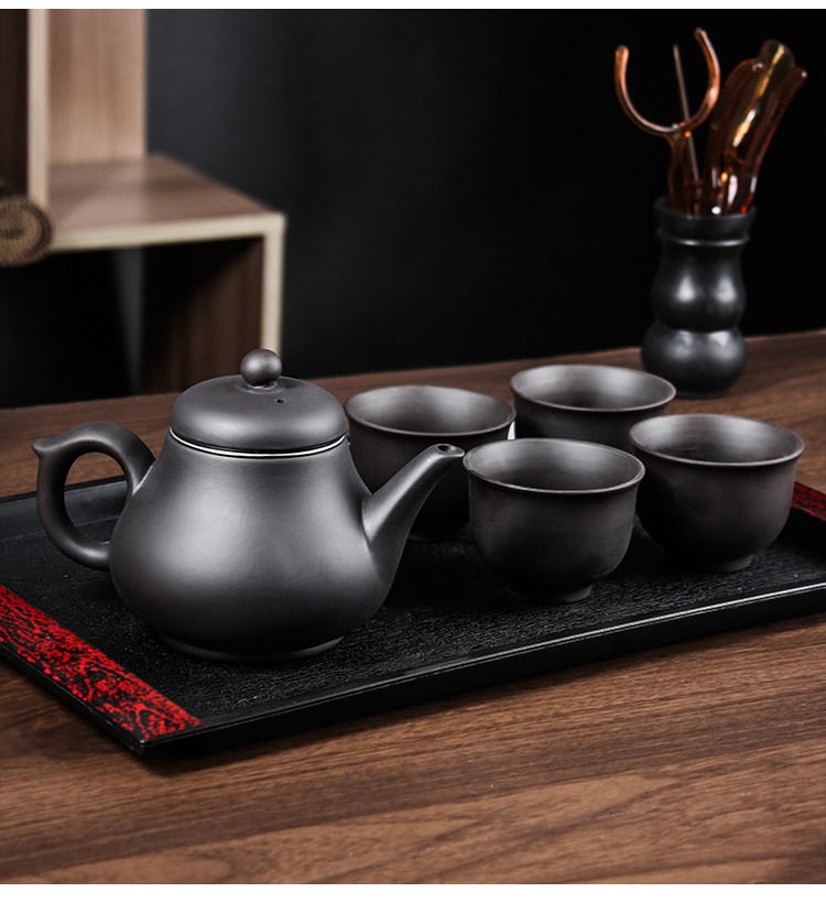 pear-shaped pot with strainer +6 large cups + wood grain tray black