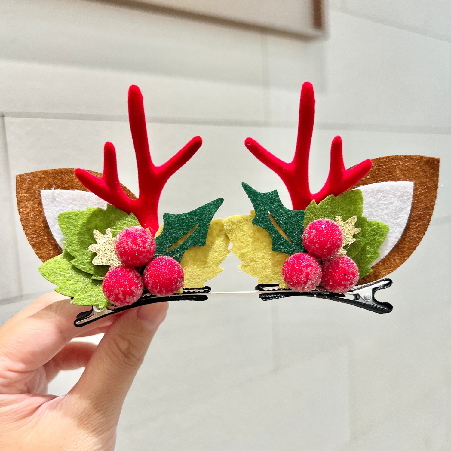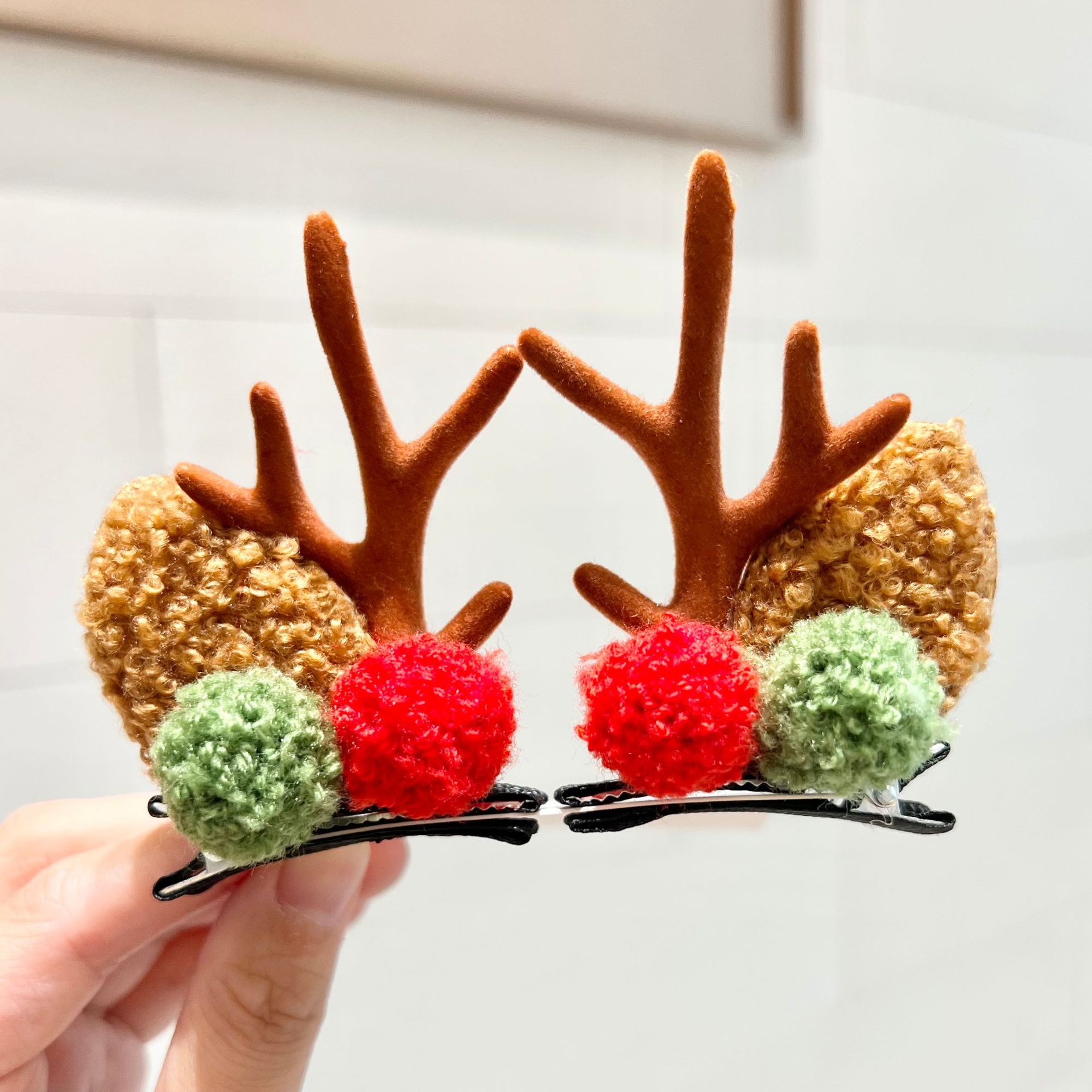 red and green ball antlers a pair of hairclips-brown