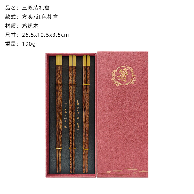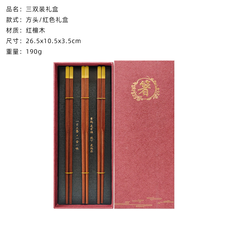 square head red sandalwood chopsticks 3 pairs (red chopsticks gift box)