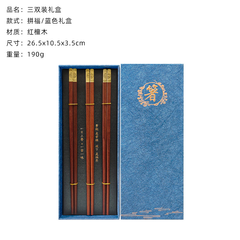 square head red sandalwood chopsticks 3 pairs (blue chopsticks gift box)