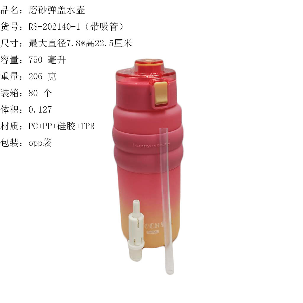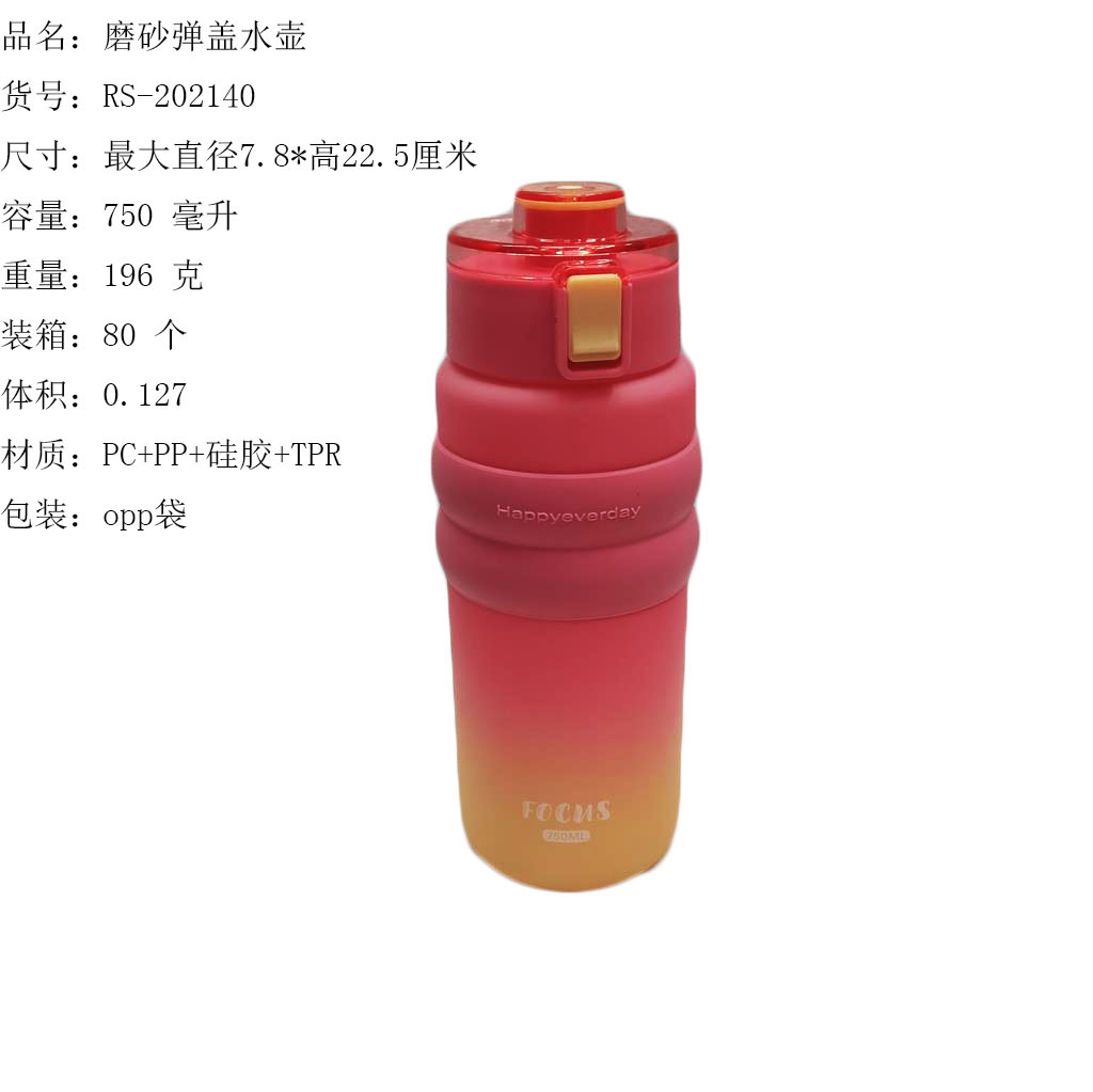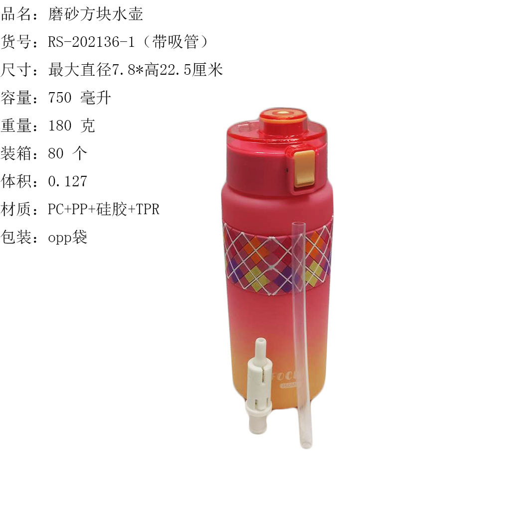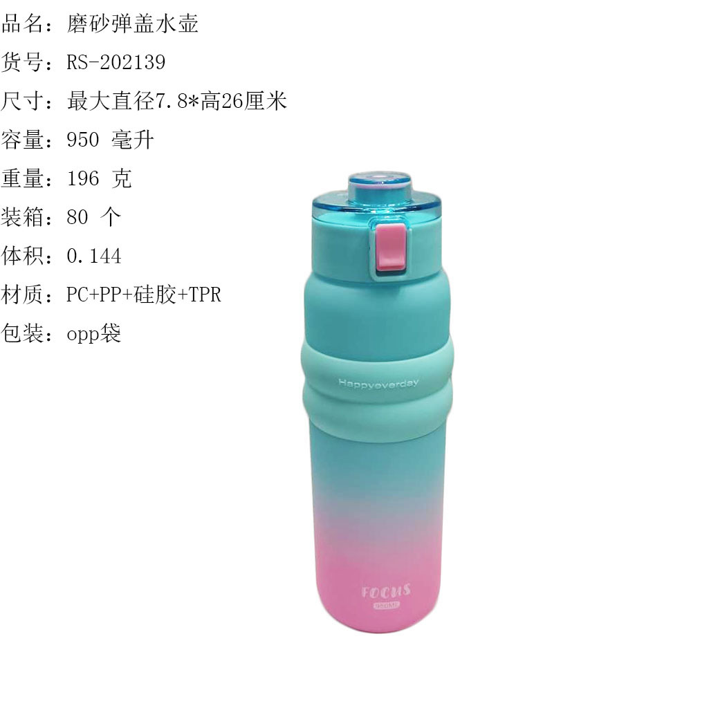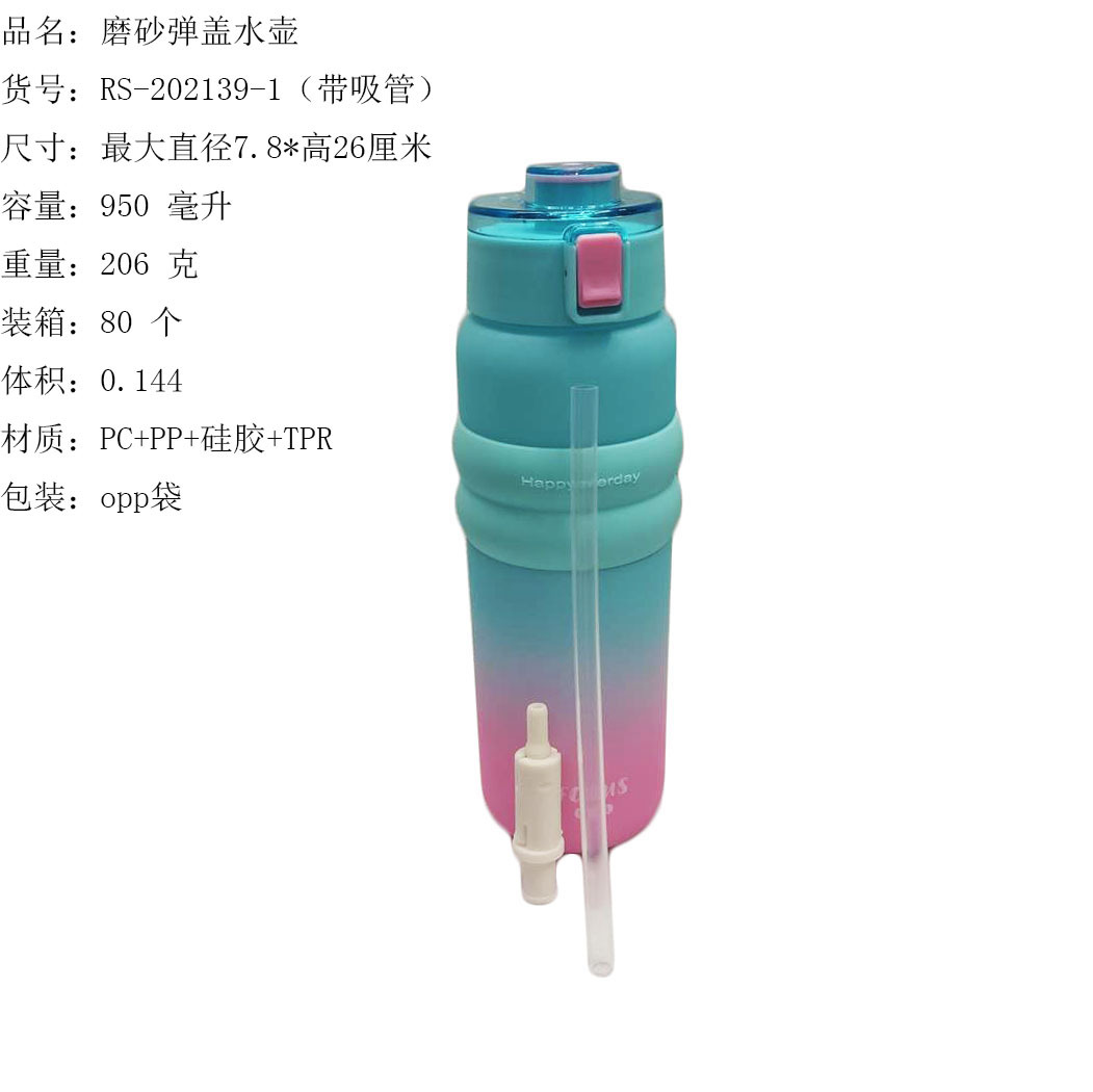 ITEM NO.【Product Model Number】: RS-202001 NAME【Product Name】: Gradient Matte Printed Water Bottle QTY【Quantity】: 80 pieces "CBM【Carton Volume】:0.15 Material【Product Material】: PC+PP+Silicone Color【Product Color】: mixed loading Weight: 153 grams Volume【Product Capacity】: 1000 ml Packaging【包装方式】:OPP袋 W.G【整箱毛重】:13.5kilogram N.G【Gross Weight of the Full Container】: 12.3 kg"斤"在中文中通常指的是重量单位,1斤等于500克。如果您需要翻译其他与"斤"相关的文本,请提供具体内容。 SIZE【Product Size】: Maximum Diameter 8* Height: 27.5 inchescentimeter