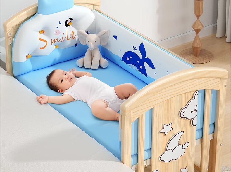 big bed + cocoanut matting + bed fence five-piece set (animal party blue)
