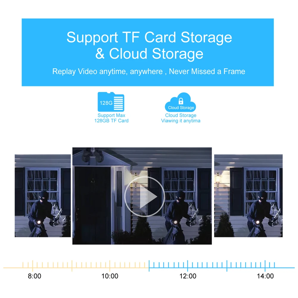 白色发光二极管可以通过应用程序远程控制: ① 打开 ② 关闭 ③ 自动 (在自动模式下,IR-cut开关自动为夜视后,红外灯将打开,它可以 智能检测人体,智能打开/关闭白光) |