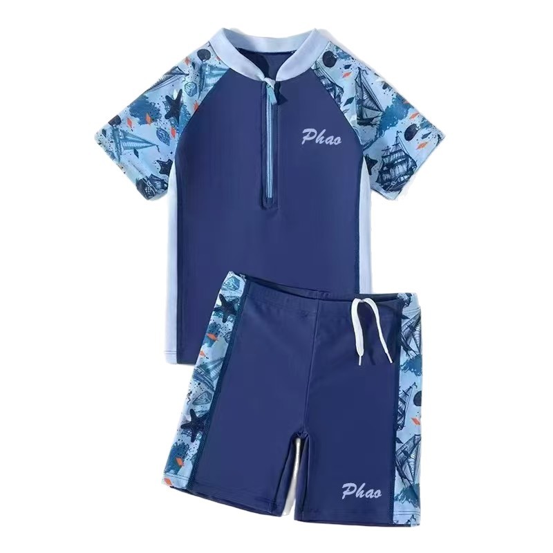 Boys split two-piece swimsuit. Nylon fabric. Fine workmanship. Good elasticity. L fits 3-5 years old. XL fits 5-7 years old. XXL fits 7-9 years old. 3XL fits 9-11 years old.