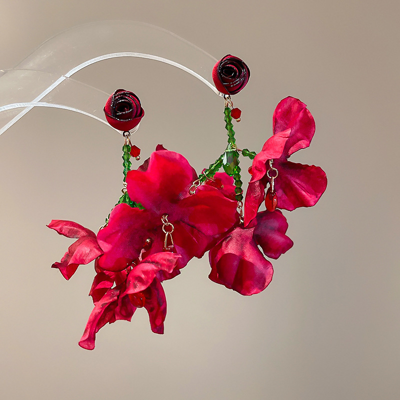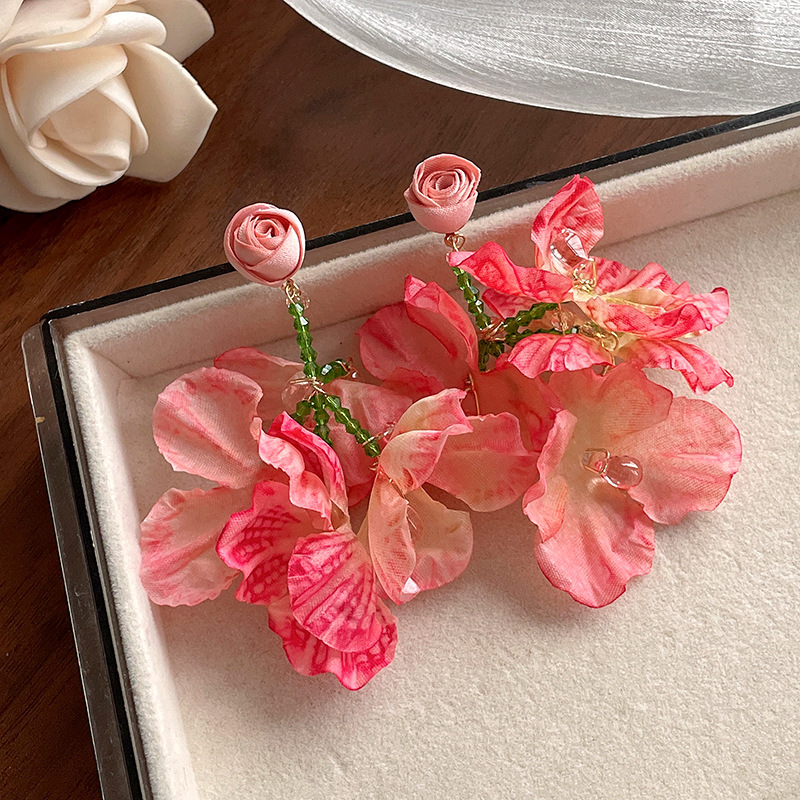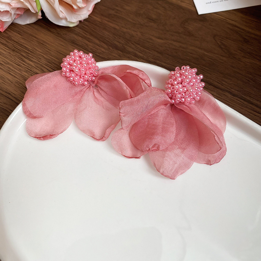 45# silver needle fabric flower tassel earrings