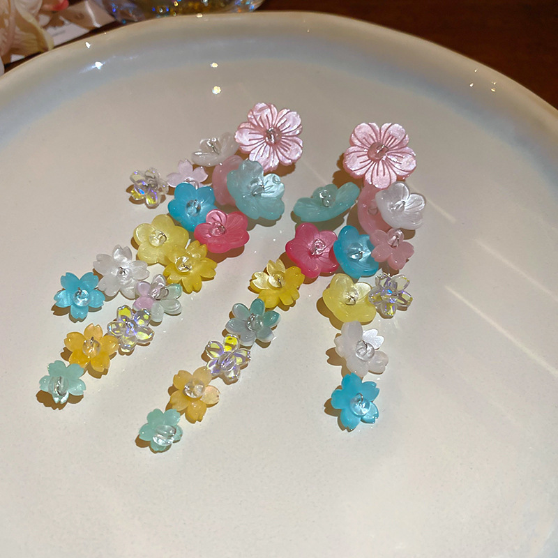 16# silver needle flower multicolored tassel stud earrings