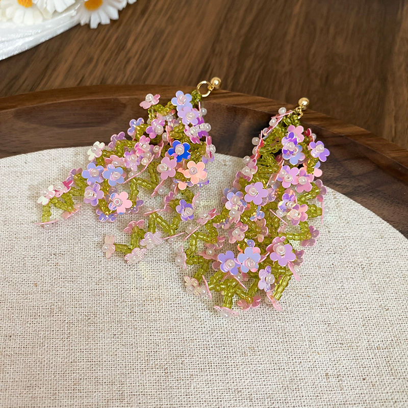 48# silver needle bead net yarn flowers leaf tassel ear studs