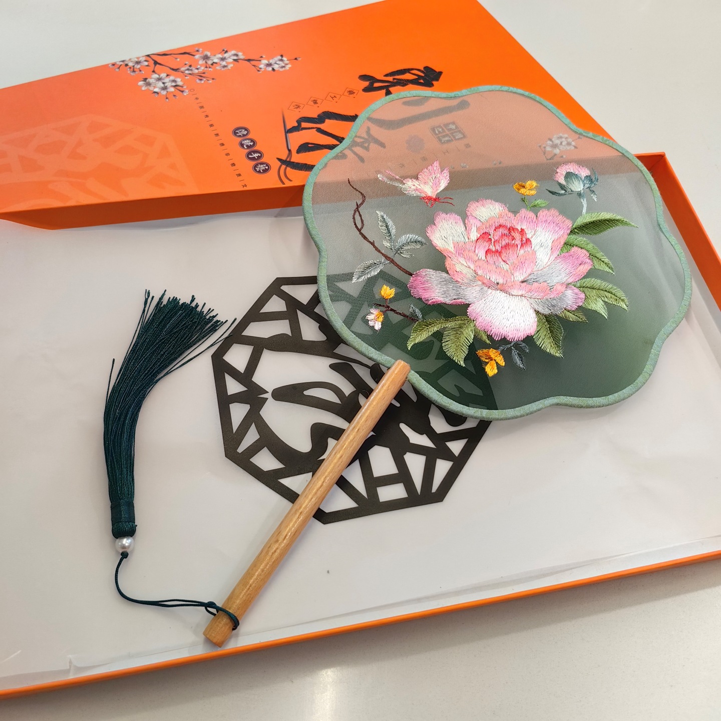 circular fan-embroidery-green background with peony