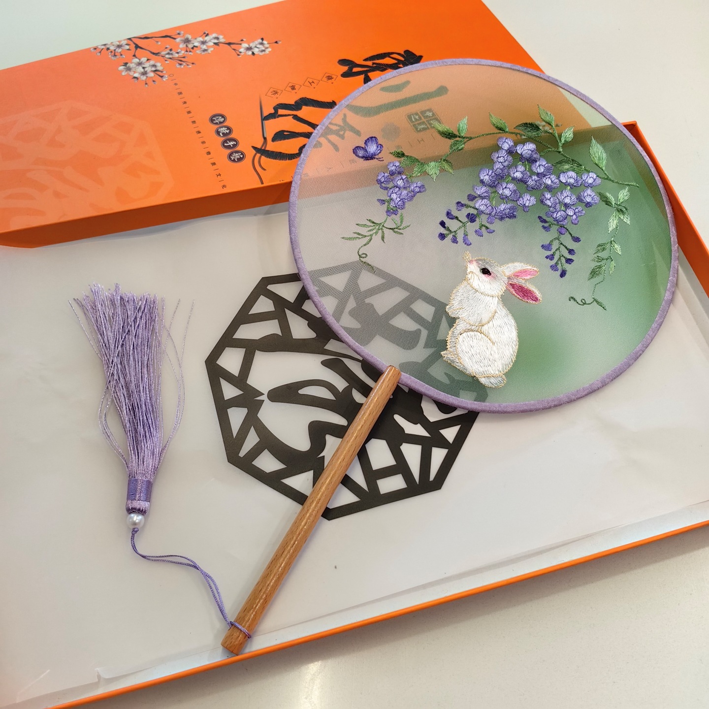 circular fan-embroidery-wisteria rabbit
