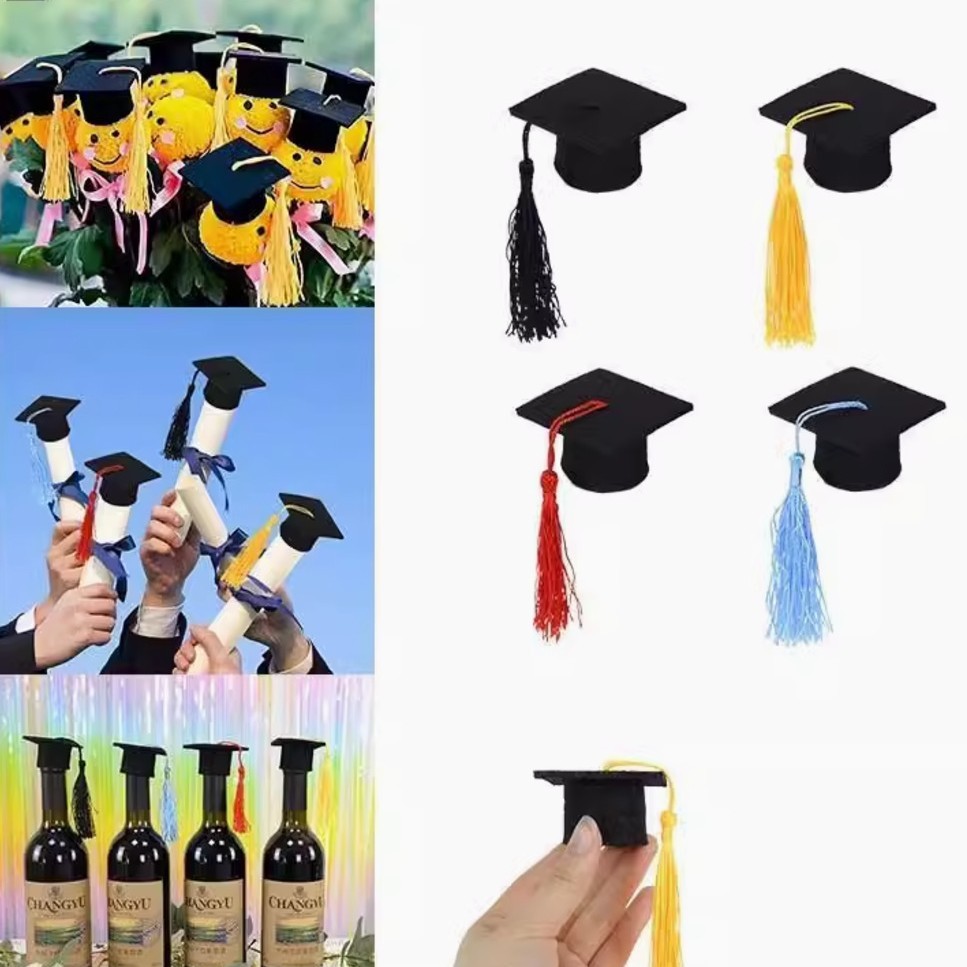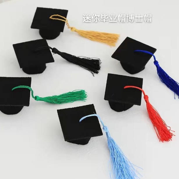 This product is a wool felt mini doctor's hat. The size is 5.5*5.5*3 cm. It is a graduation decoration. Suitable for various graduation toys such as wine bottles, bouquets, and doll toys. The hat can be customized in size and color. Please contact the customer service for details.