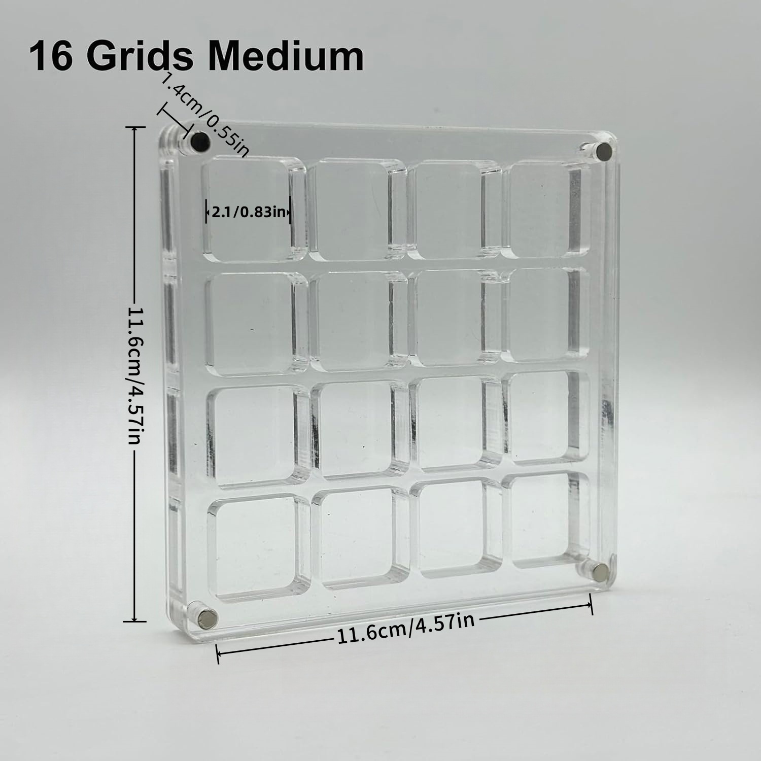 16 compartments, 11.6cm x 11.6cm, thickness 1.4cm, inner compartment 2.1cm