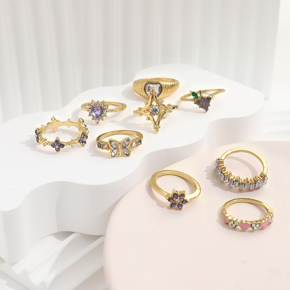 • Product Name: Foreign Trade Personality Female Accessories Fashion Trendy Pink Heart Butterfly Purple Diamond Grapes Flower Geometric Ring Nine-piece Set