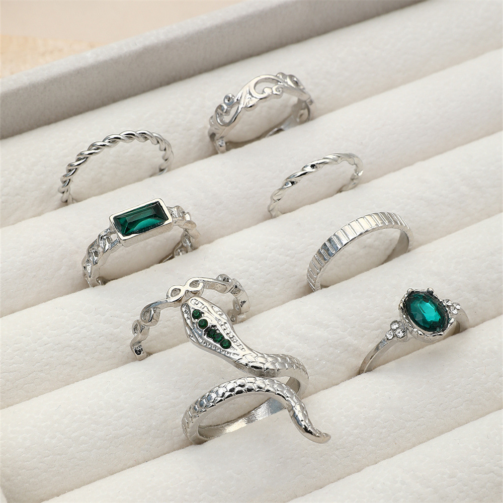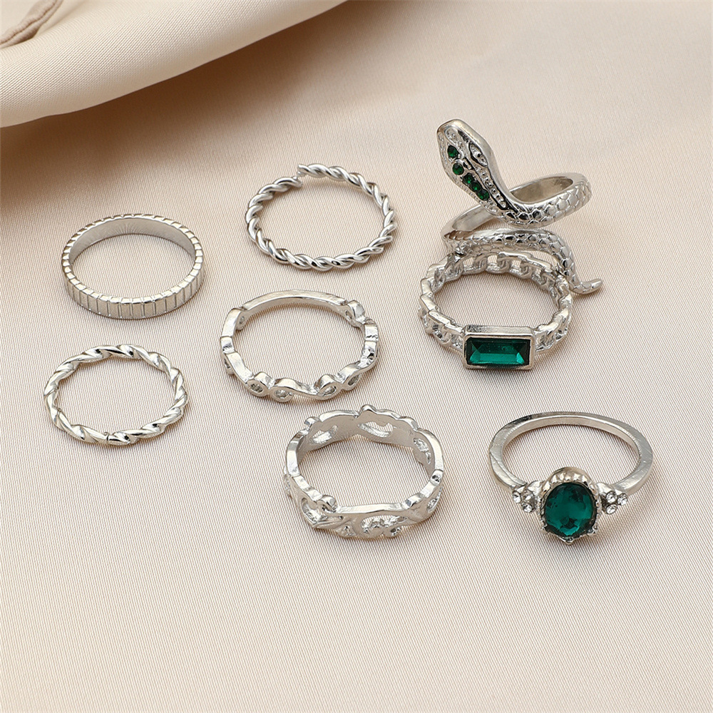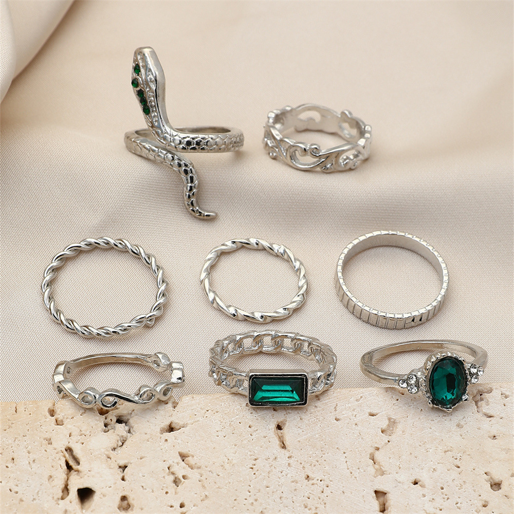 europe and america cross border new retro imitation emerald ring versatile personality twist snake-shaped diamond-studded ring 8-piece set for women
