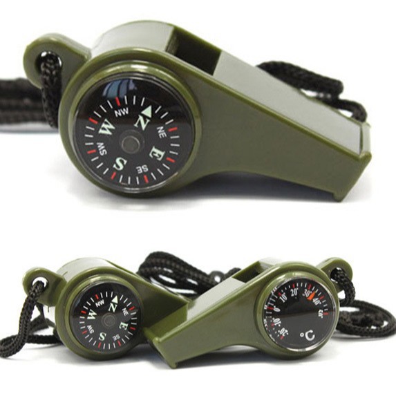 Whistle, thermometer, compass, three in one