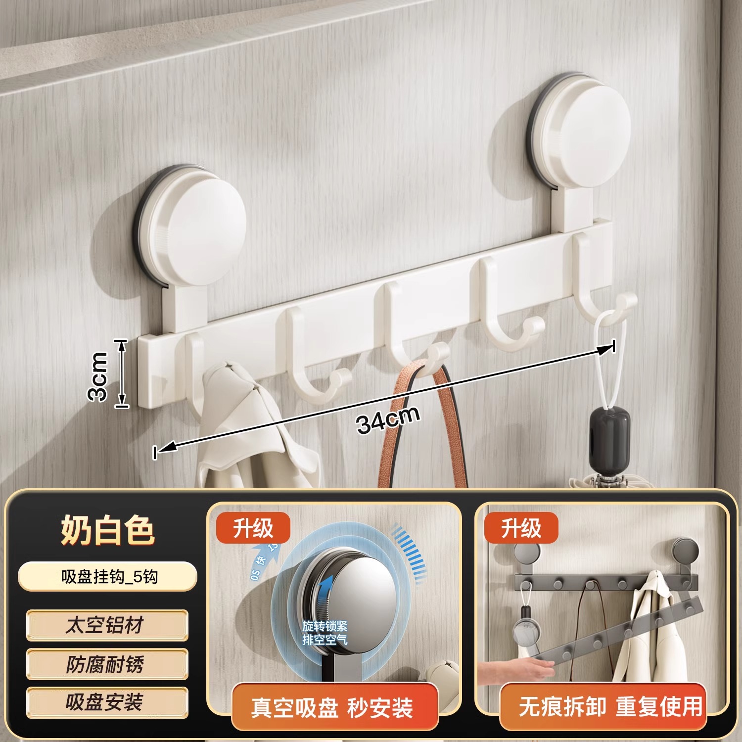 suction cup behind the door-milk white double hook-5 hook [strong suction cup up and down storage]]