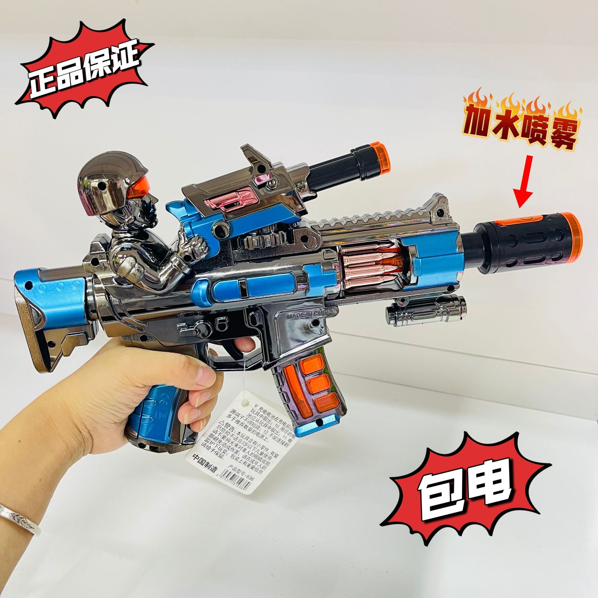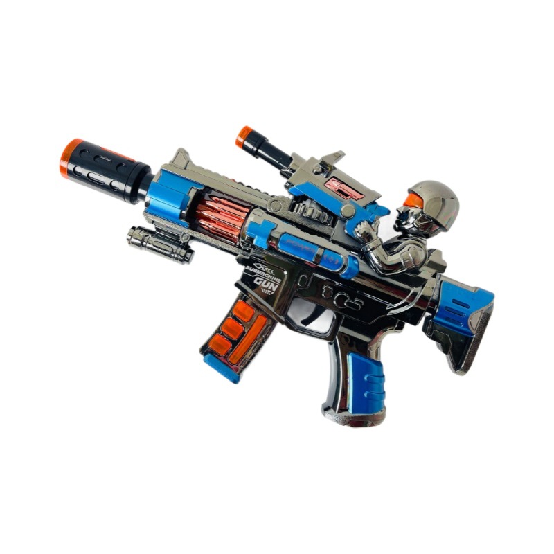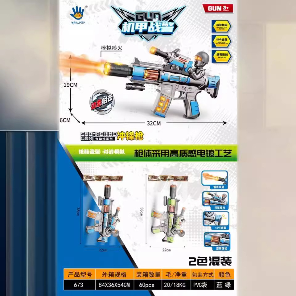 Electric spray toy gun with the product dimensions of: length 32cm, width 6cm, height 19cm, requires 3 AA batteries (batteries included), and a rechargeable option is available. The product glows and makes noise, with a rotating and retractable feature. The gun head has a yellow lid that can be opened to add water for spraying. The material is electroplated plastic. The packaging is in an OPP bag, and the shipment is packed with air foam film to prevent pressure damage, and the product is tested to ensure it is OK before shipping. A box of 60 pieces is packaged in a bag, and there are also display boxes for 6 pieces.