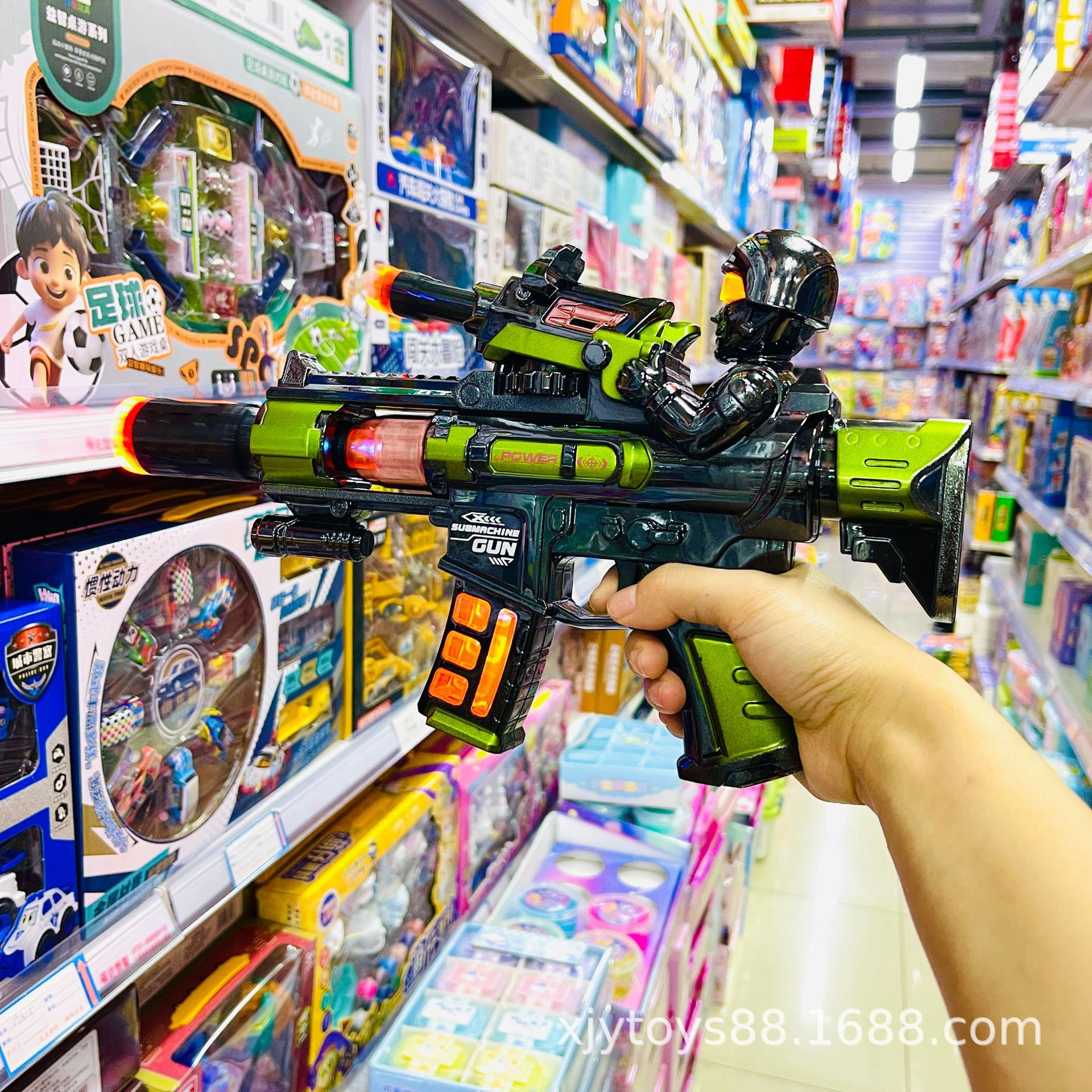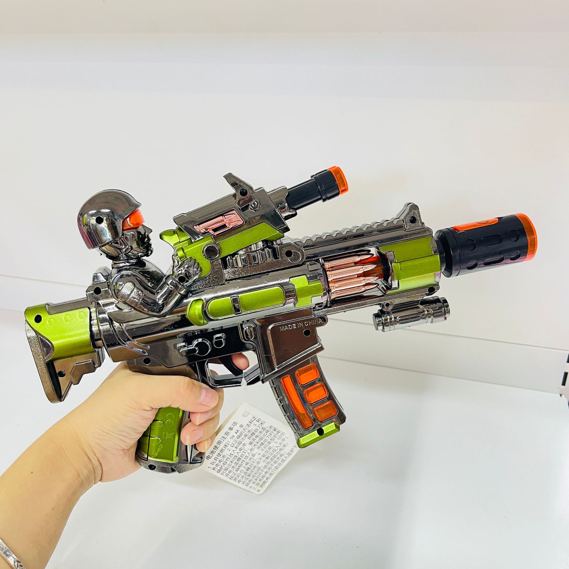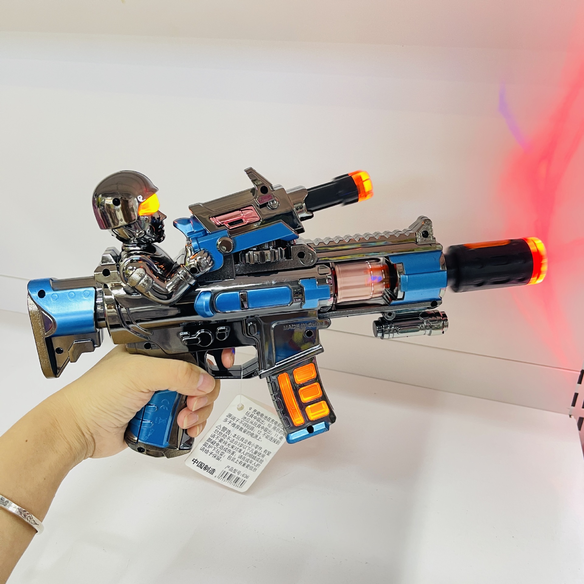 Electric spray toy gun with the product dimensions of: length 32cm, width 6cm, height 19cm, requires 3 AA batteries (batteries included), and a rechargeable option is available. The product glows and makes noise, with a rotating and retractable feature. The gun head has a yellow lid that can be opened to add water for spraying. The material is electroplated plastic. The packaging is in an OPP bag, and the shipment is packed with air foam film to prevent pressure damage, and the product is tested to ensure it is OK before shipping. A box of 60 pieces is packaged in a bag, and there are also display boxes for 6 pieces.